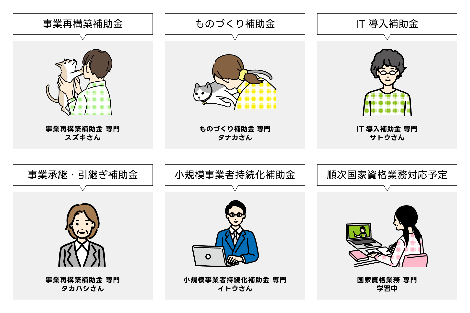 5大補助金を専門学習した各担当AI派遣スタッフをご紹介します。