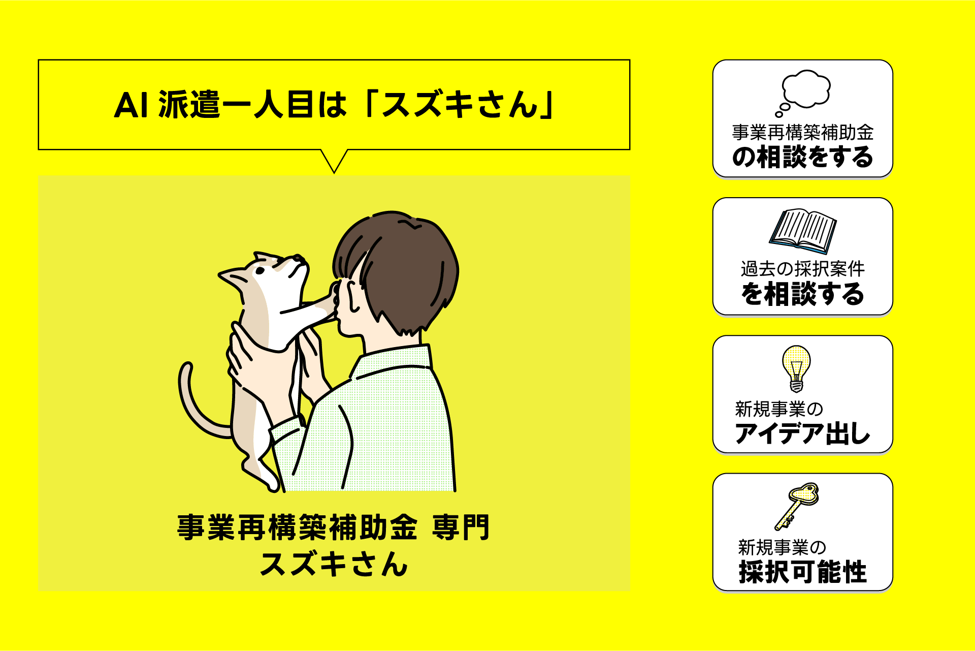 2023年8月28日(月) から、AI派遣スタッフの一人目として事業再構築補助金を専門学習した「スズキさん」の先行派遣がスタートしました。