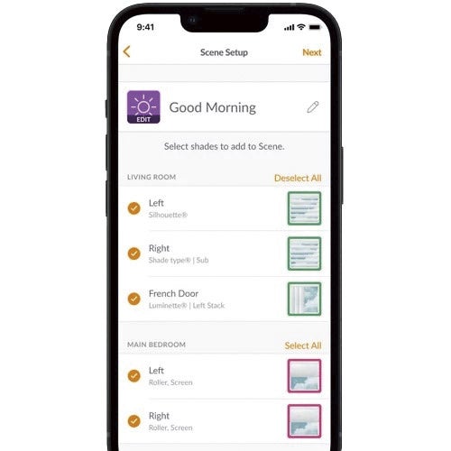 お好みの停止位置を設定しシーンを作成すると、画面のタップのみでシェードを操作できます。日の出にシェードを開ける、日の入りでシェードを閉めるなどさまざまなシチュエーションに合わせてシーンを設定する事ができます。