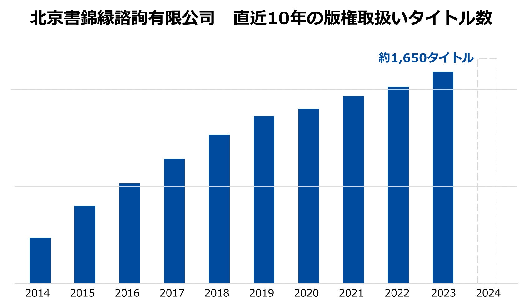 「書を以て日中の縁をつなげる」という意味を込めて名付けられた北京書錦縁は、2004年に日本の出版社が所有する版権を中国へ拡大させるべく、書籍販売会社の北京書中縁図書有限公司との合弁会社として設立しました。日本コンテンツの中国での出版コーディネイトを中心に事業を展開しており、これまで100社を超える出版社と連携しながら、ジャンルは児童書から小説まで幅広く取り扱い約1,650タイトルの版権を中国語簡体字版にて出版し、総累計印刷数は約2,000万部です。