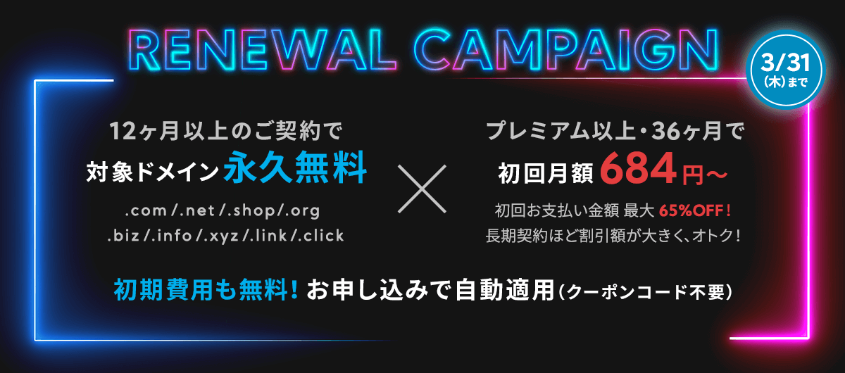 (65%OFF対象プラン:プレミアムプラン以上、36ヶ月のご契約)