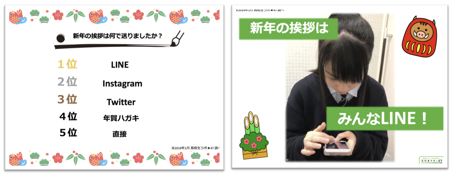 続いてInstagram、Twitterと続き、気軽に使用できるSNSを新年の挨拶のツールとして使う高校生が多いようです。
