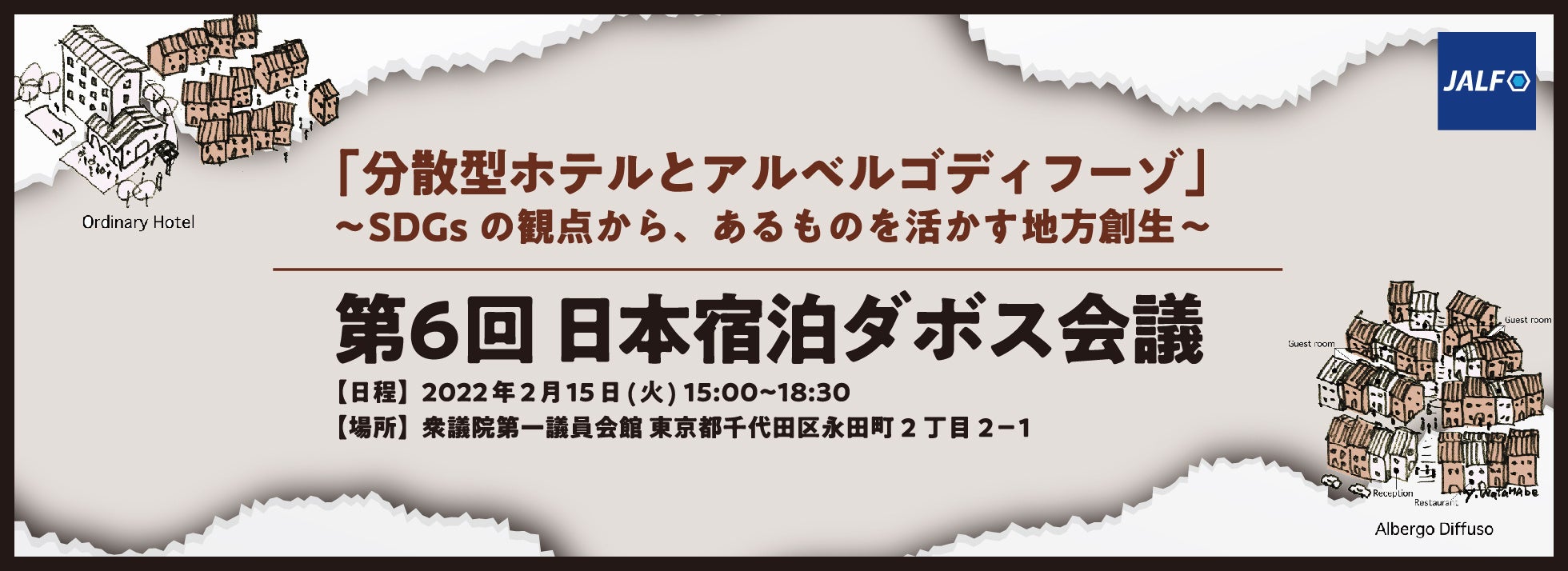 財団法人宿泊施設活性化機構(所在地:東京都港区虎ノ門一丁目、事務局長:伊藤泰斗)は、2022年2月15日(火)に午後3時から、第6回日本宿泊ダボス会議「分散型ホテルとアルベルゴディフーゾ 〜SDGsの観点から、あるものを活かす地方創生〜」を東京都千代田区衆議院第一議員会館 国際会議場にて開催及び配信します。限定人数で会場参加可能です。