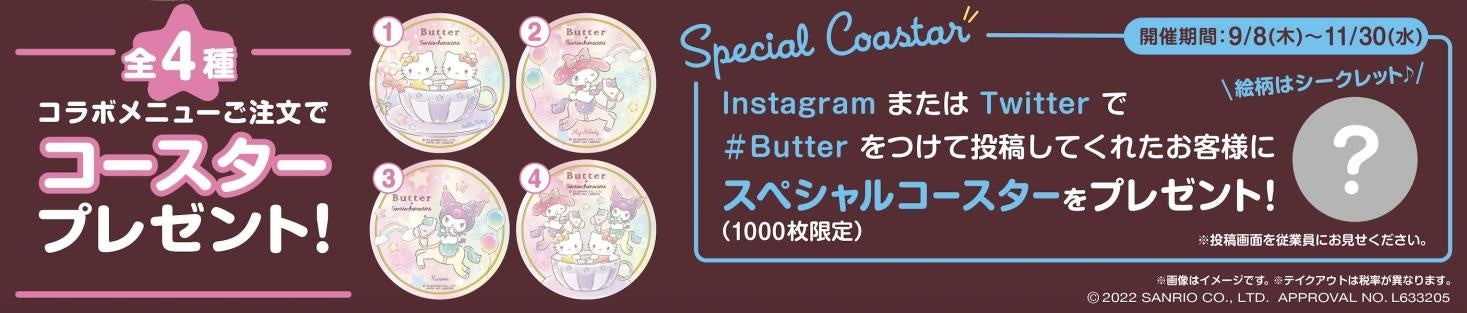 期間中、サンリオのキャラクター商品お買い上げでButterでご飲食すると上記のコラボコースターをプレゼント!
