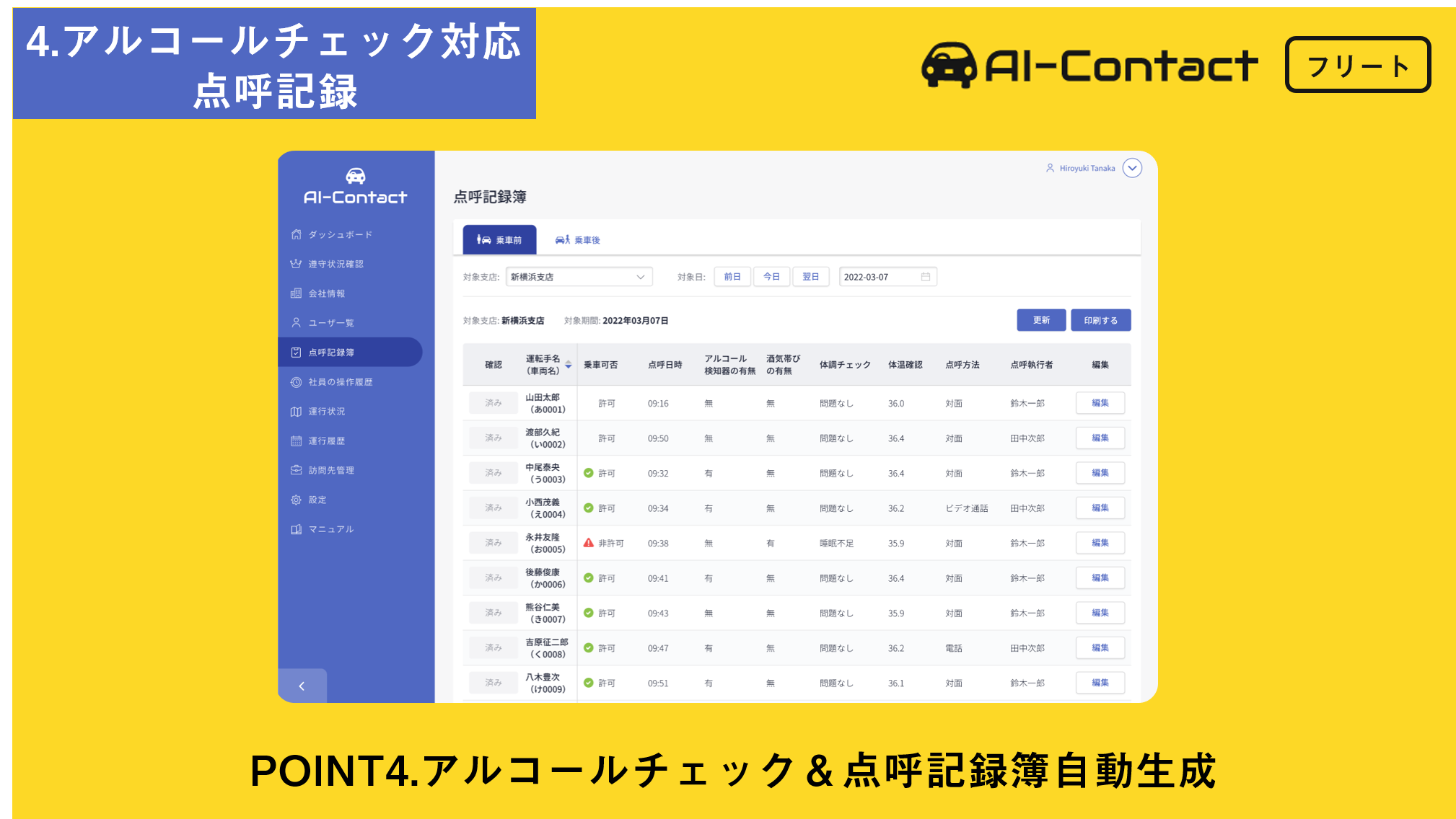 AI-Contactフリートではアルコールチェック確認と点呼記録簿の保存について、法令に準拠した形で電子運用することが可能です。