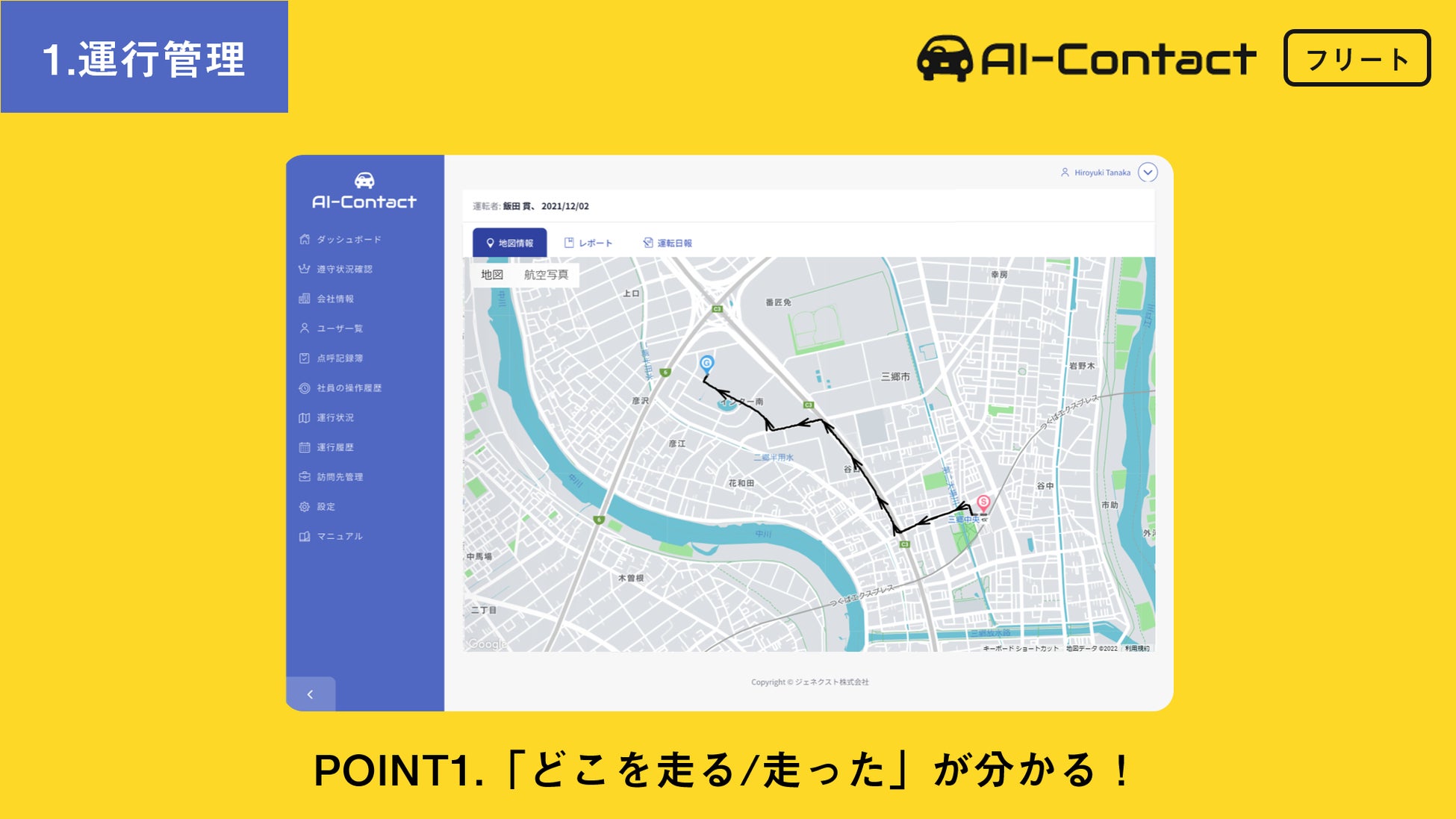 車両管理台帳や運転日報を紙で管理している会社や、顧客からの急な依頼が多い会社などは、業務効率化や社員の交通安全管理のDX化のニーズが高いものの、通常システム導入にはコストがかかり二の足を踏んでいるケースが多くあります。そういった課題やニーズを受け、「AI-Contact フリート」は「1.運行管理」「2.動態管理」「3.車両管理」「4.アルコールチェックを含む点呼記録」など交通違反検知機能を除いたサービスを初期費用・月額費用・その他費用を完全無料で永年提供しています。
