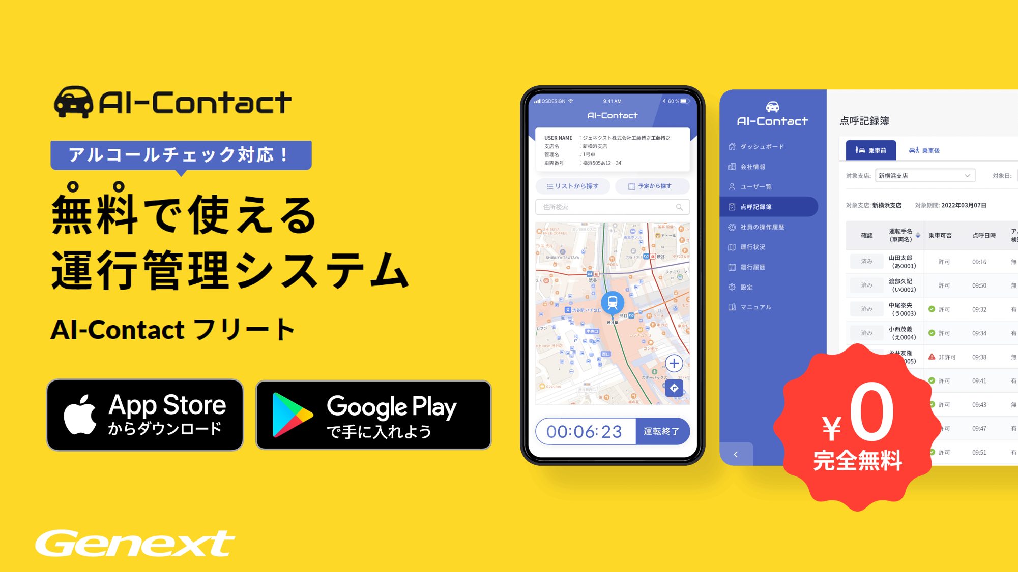 交通安全事業を手掛けるジェネクスト株式会社(横浜市港北区、代表取締役:笠原一)は、2022年4月6日よりAndroid版のみ提供しておりました完全無料の運行管理アプリ「AI-Contact フリート」につきまして、iOS版を2022年6月1日より提供開始したことをお知らせいたします。