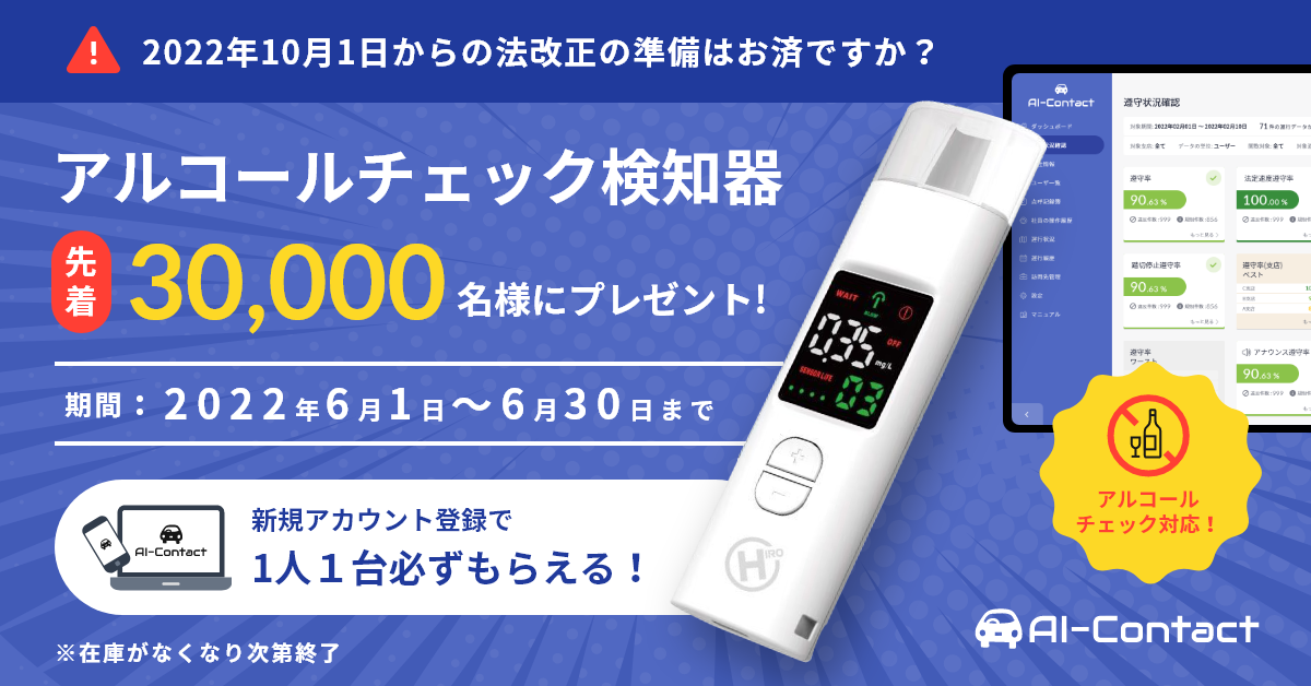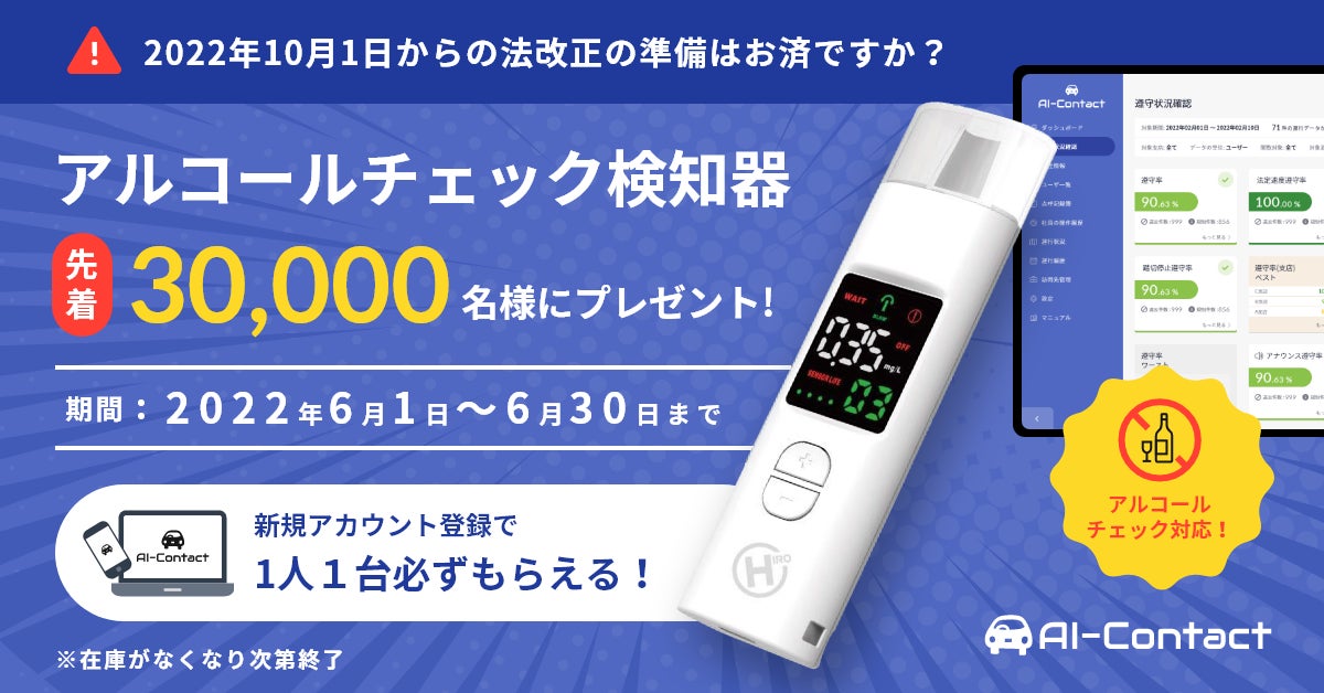 2022年10月1日より白ナンバー事業者のアルコール検知器の利用が義務化される道路交通法改正を受けて、有料版製品である「AI-Contact モバイル」または「AI-Contact NOW」を6月中にお申込みいただくと、先着3万名様限定でお申し込みアカウント数と同台数のアルコール検知器をプレゼントするキャンペーンも実施しております。