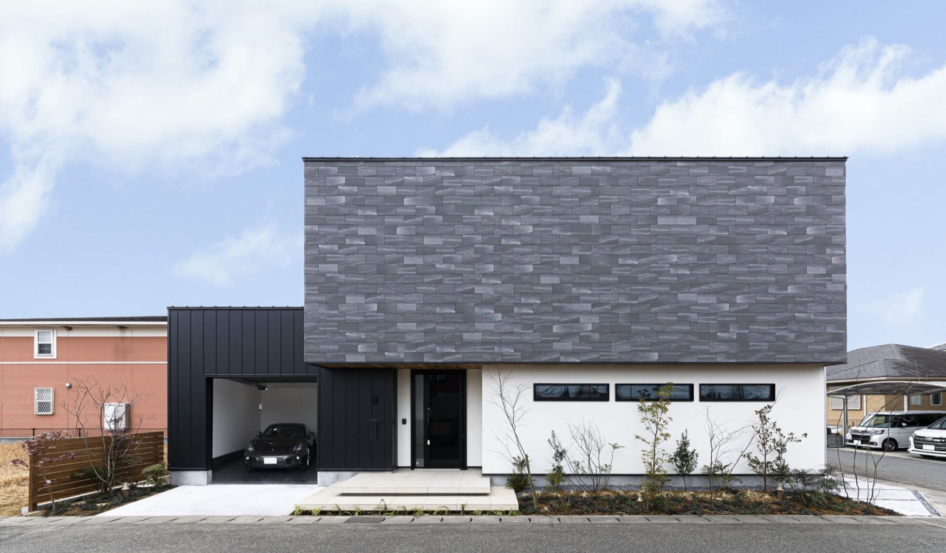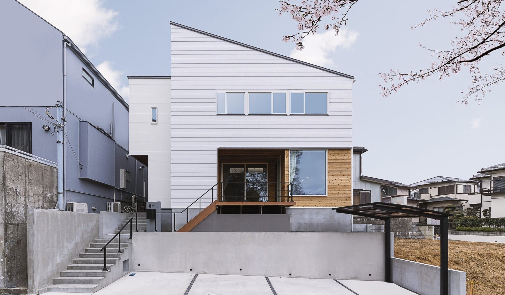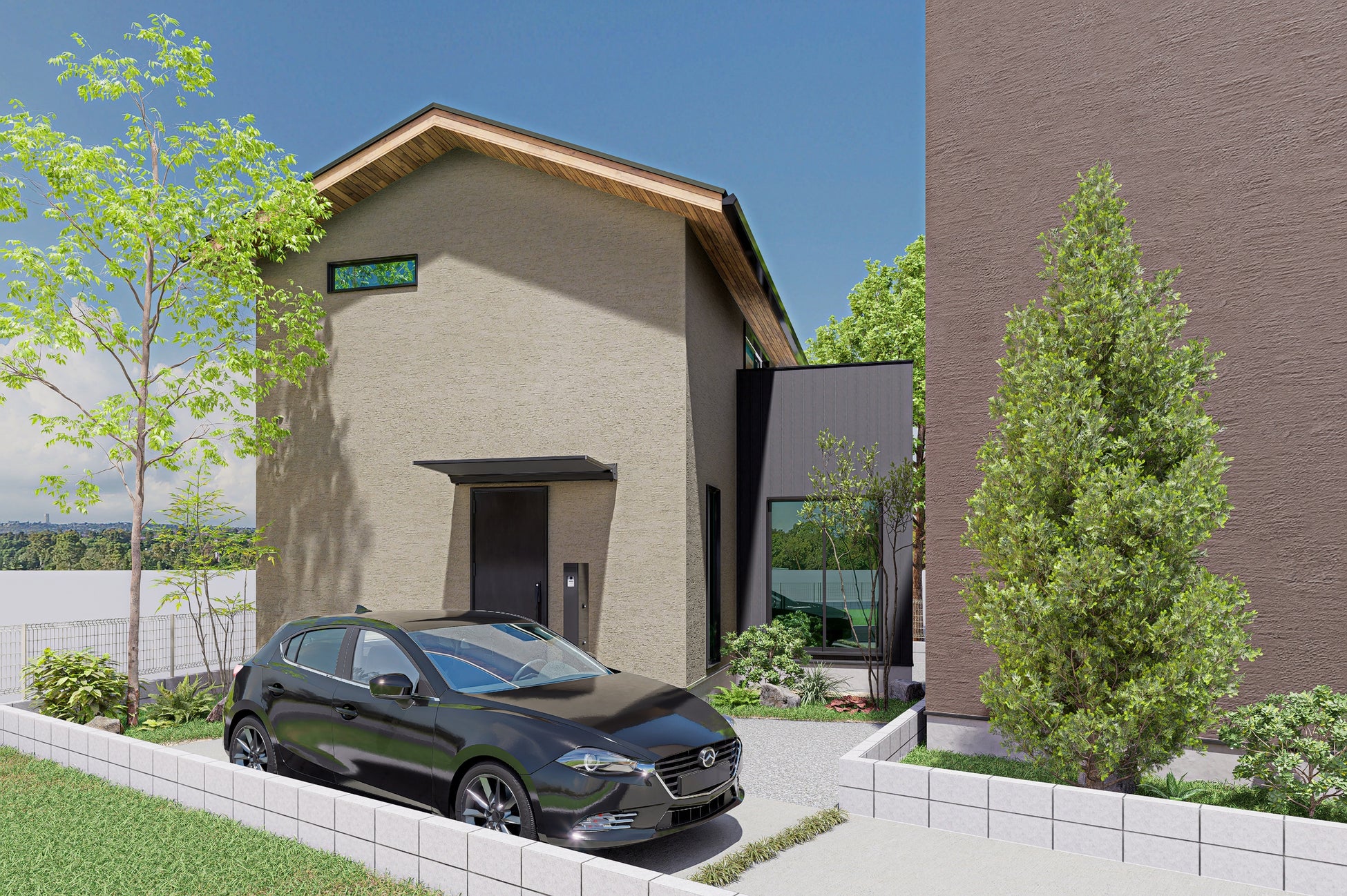 三角屋根と軒を備えた、伝統とモダンが融合する美しい外観。2階LDKは、勾配天井と大きな窓によって陽光がたっぷりと差し込む明るく開放的な空間となっています。家族と団らんやリラックスタイムがより豊かなものになる、機能性と快適性にこだわったお住まいです。