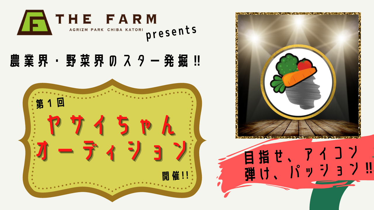 「ヤサイちゃん」オーディションは、野菜への熱いパッションを持ち、魅力的な個性を持つオンリーワンの人材を発掘し、野菜界や農業界のスターをプロデュースすることを目的に実施するオーディションです。優勝者は農業界・野菜界のスター「ヤサイちゃん」として活動し、優勝特典は、賞金50万円や年間300万円相当のプロモーションサポート、メディア出演などのバックアップもあり、オーディションのゴールドスポンサーである農園リゾート THE FARMがサポートをします。野菜や農業について情熱があり、魅力的に伝えられる人を求めています。是非一緒にスターへの道を進んでみませんか。