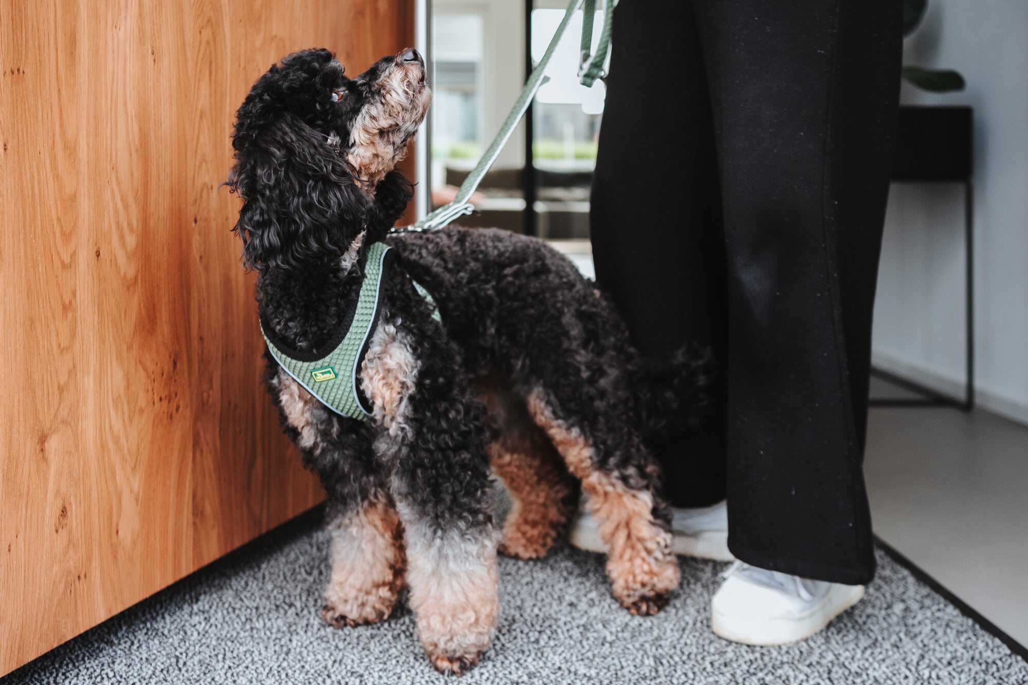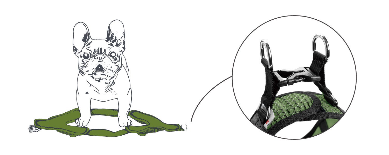 頭を通す際に嫌がるワンちゃんでもつけやすいハーネスです。