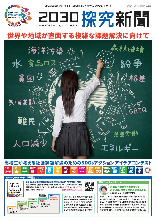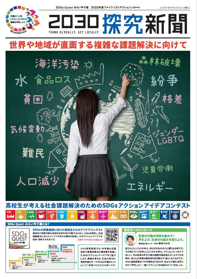 2022年度全国138チームのファイナリストのSDGsアクションアイデアは本年度の探究学習のヒントとなるように、QRコードによるプレゼン動画を掲載した普及啓発媒体“2030探究新聞”として発行し、対象エリアの全ての高校に配布しています。