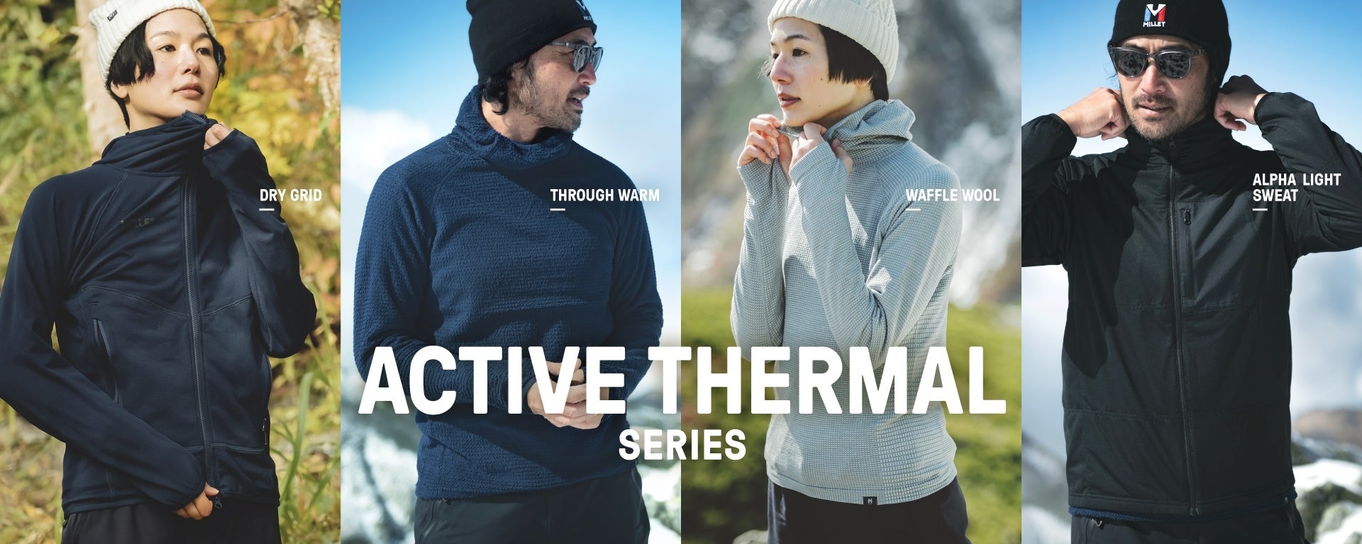 1921年創業のフランスを代表するアルパインブランド “ミレー” (ミレー・マウンテン・グループ・ジャパン:東京都品川区、代表取締役:ペア・ラスムセン)は、行動中に必要とされる機能(保温や通気、吸水速乾など)を、先端の技術や独自開発の素材によって巧みに操作し、特徴的な4つのサーマルを開発しました。アクティブに動き続けている時にこそ、その機能を発揮することから、これらの保温着を “アクティブサーマル” と銘打ち、2024年8月30日より発売開始いたしました。( https://www.millet.jp/brand/feature/thermal/ )