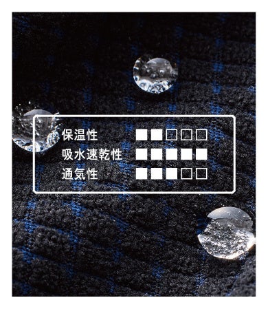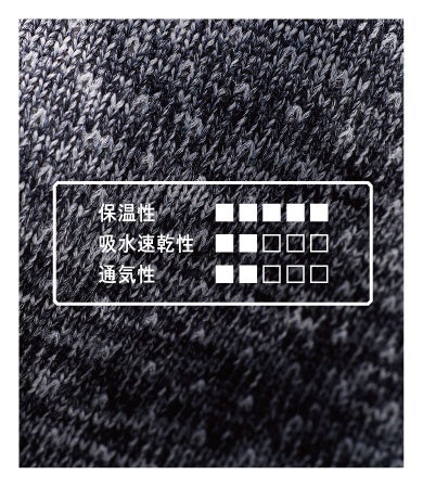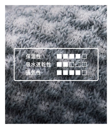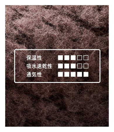 天然の快適性を備えた高品質メリノウールと、耐久性や速乾性に優れた化繊との混紡素材によるワッフル生地を、計算されたコンピューター編みで仕上げることによって、絶妙なフィット感と保温性、通気性をバランスよく実現しました。
