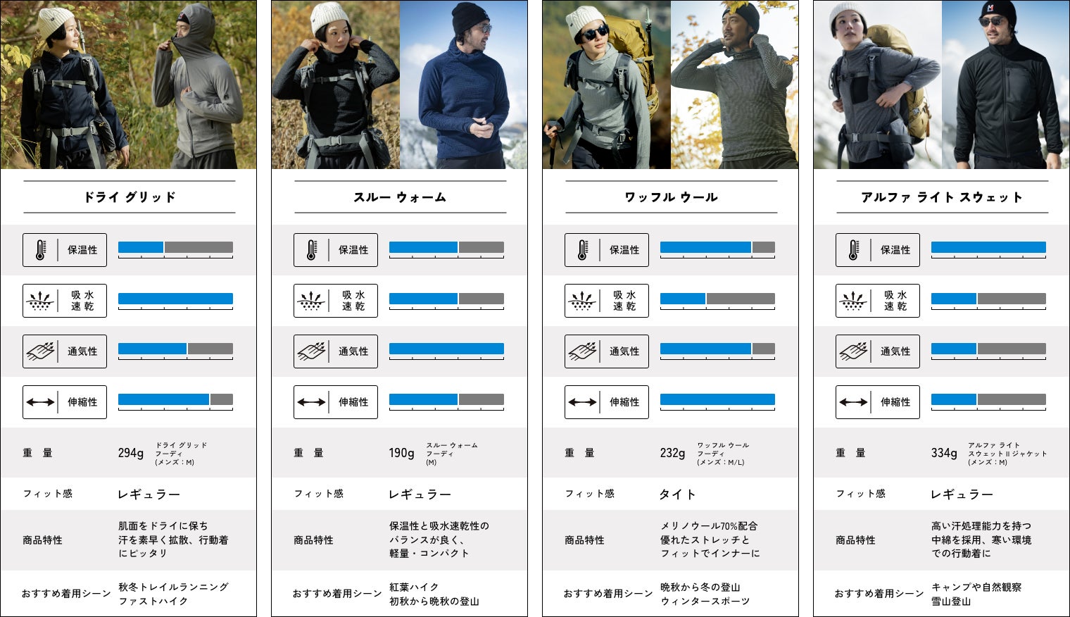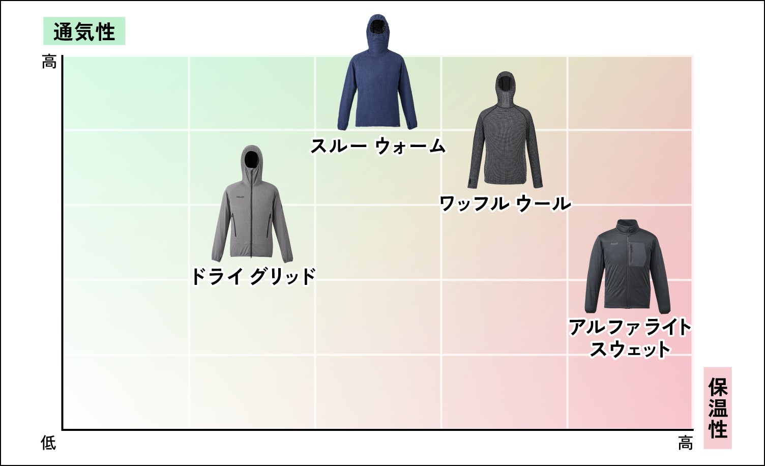 通気性が高いスルーウォームから、保温性に優れたアルファライトスウェットまで、登山環境に合わせて最適なレイヤリングをアクティブサーマルシリーズでは実現できます。