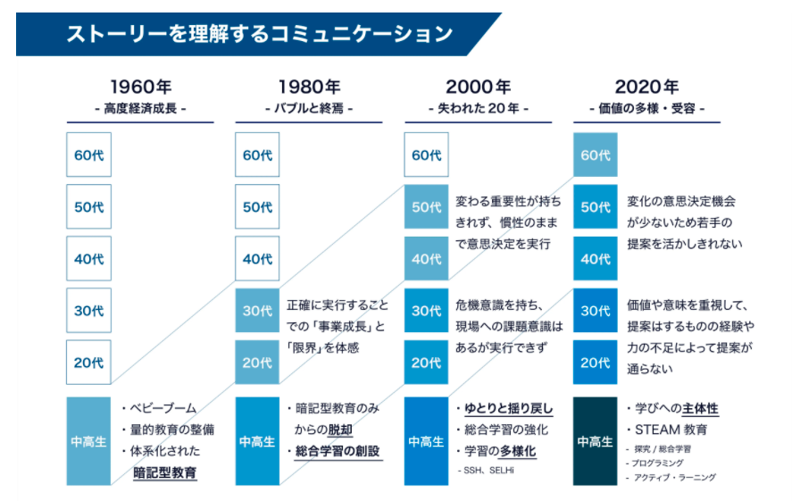 例えば、このように各世代によってこれだけ「教育によって大切とされること」が移り変わってきました。