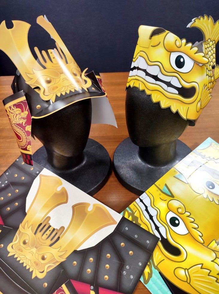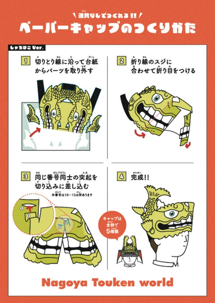 1枚の紙から、道具を使わずに簡単に作ることができる有料のペーパークラフトで、完成すると兜や金シャチの形をした帽子になります。(※お子様向けサイズです。)