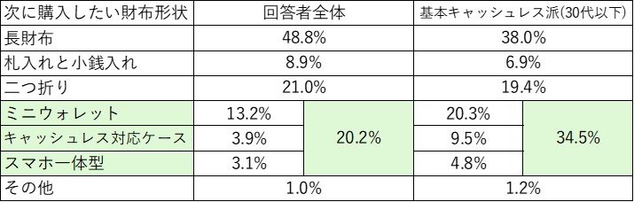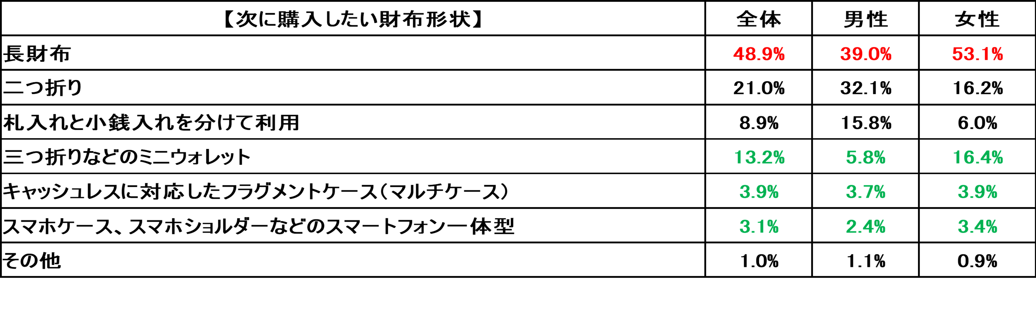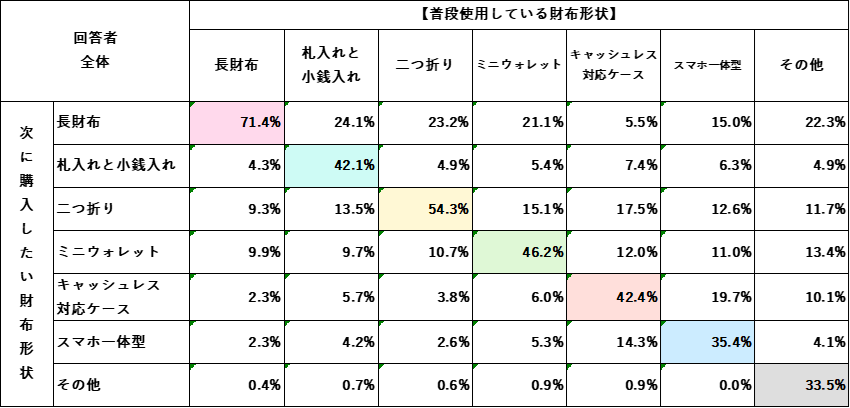 また、「次に購入したい財布形状」を「普段使用している財布形状」毎に集計したところ、次に購入したい財布形状は現在使用している財布形状と同一、との回答が全ての財布形状で最上位を占める結果となった。なお、詳細分析では女性より男性、若年層より中高年層の方が普段使用中の財布と同一形状の財布への買い替えに強く拘る傾向も読み取れた。