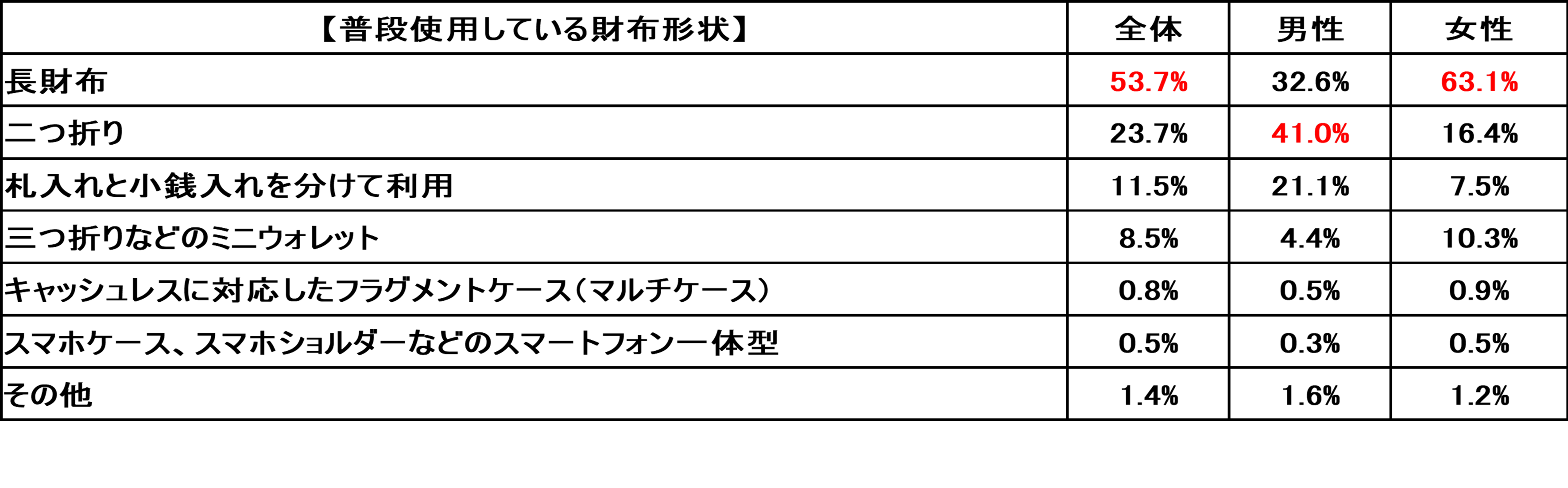 また、今回のアンケートで「普段使用している財布形状」、「次に購入したい財布形状」への回答を求めたところ、回答者全体では約54%が「長財布」を普段使用し、次点は約24%の「二つ折り」となったが、女性は「長財布」63%「二つ折り」16%、男性は「二つ折り」41%「長財布」33%と、男女で1位2位が逆転。