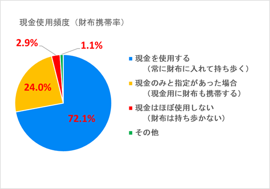 「普段現金を使用するか」という設問に対し72%以上が日常的に現金を使用し、24%が「現金のみと指定があった場合」は現金を使用すると回答。