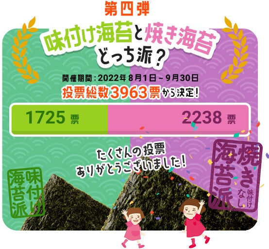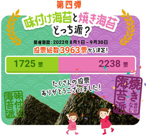 昨年行ったおにぎり総選挙の第4弾は「焼き海苔」派か「味付け海苔」派かで焼き海苔派が2238票の投票を受け勝ちました。前々回の具材選挙ではさけが一強の強さを見せました。