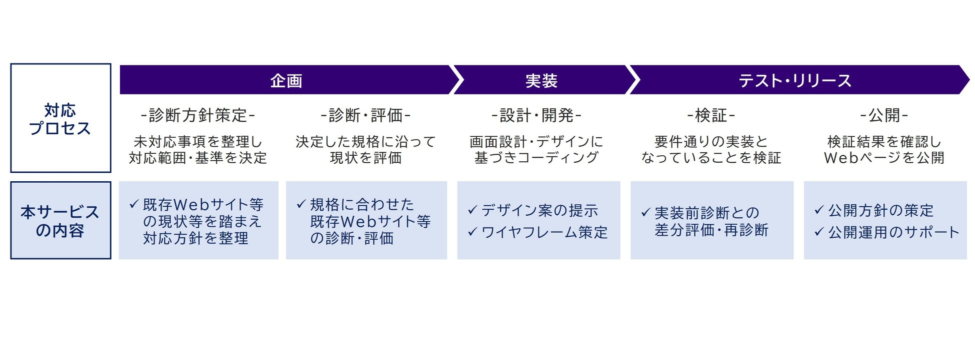 プロジェクトカンパニーのウェブアクセシビリティ対応支援サービスでは、目指す規格* に合わせた既存Webサイト・スマートフォンアプリの診断、改善提案および結果検証までトータルにサービスを提供します。
