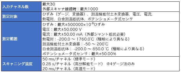 ※1 0.1×10-6ひずみ(-6は指数)の高分解能で、20000×10-6ひずみ(-6は指数)まで測定(4ゲージ法のみ)。