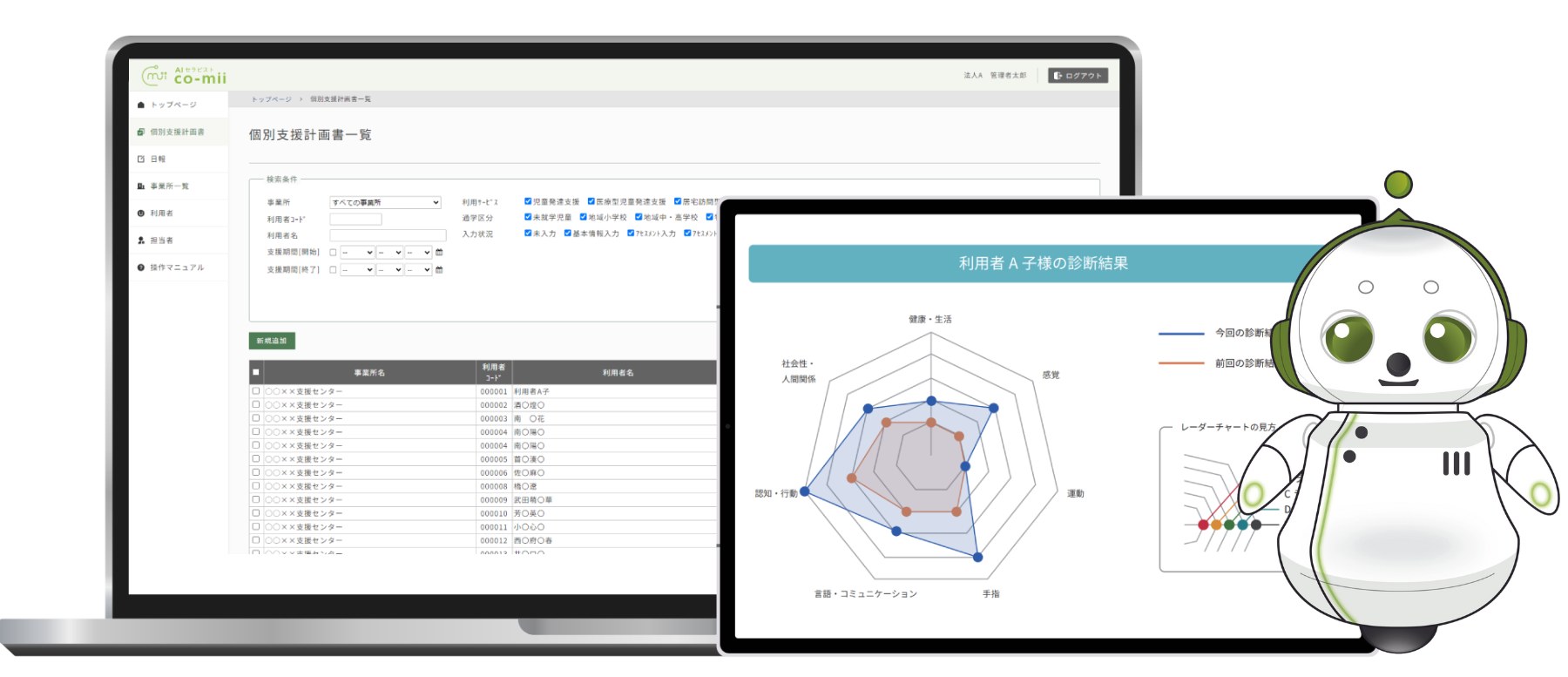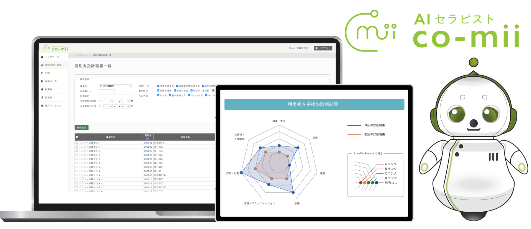 障がい児通所支援での「発達特性診断」「個別支援計画書の自動発行」「支援メニュー提示」を一括で行うサービス『AIセラピスト co-mii』を10月1日に正式リリースしたことをお知らせいたします。