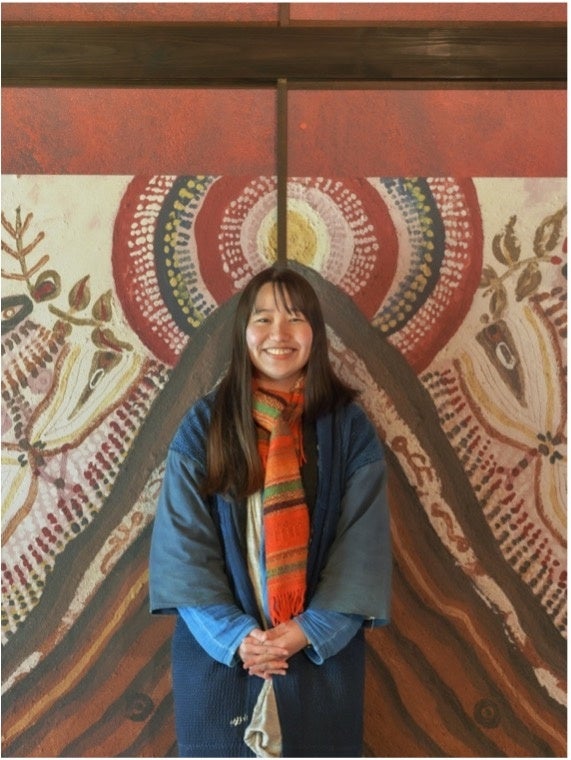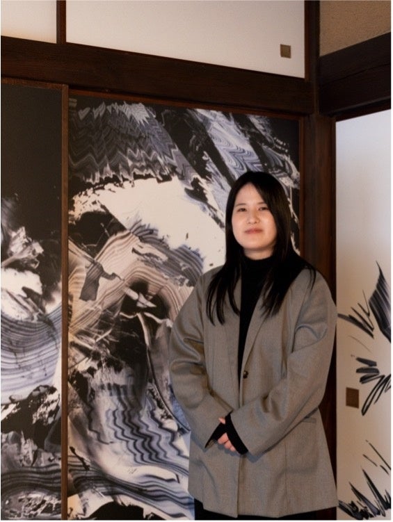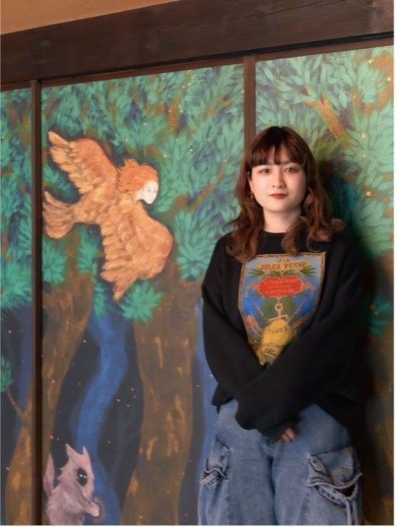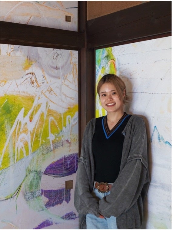 「もともと、私の絵画作品は、どの角度から見てもいいものとして制作しています。ここでは、襖を動かすと図柄や色の配置が変わるので面白い。自然にはない色を使っているので、一見合わなさそうなものが並んだ時に新しいものが見えるのも楽しめます」(松岡柚歩・談)