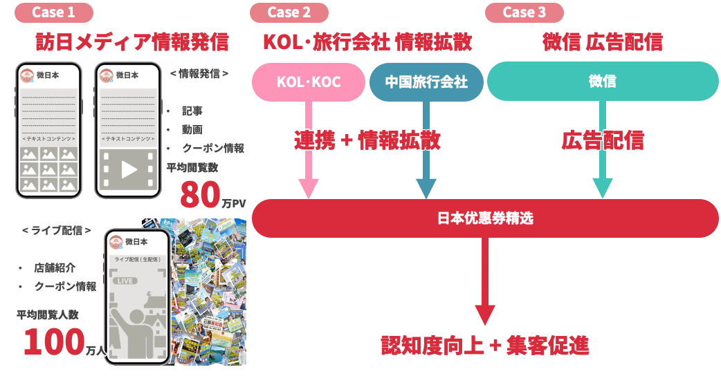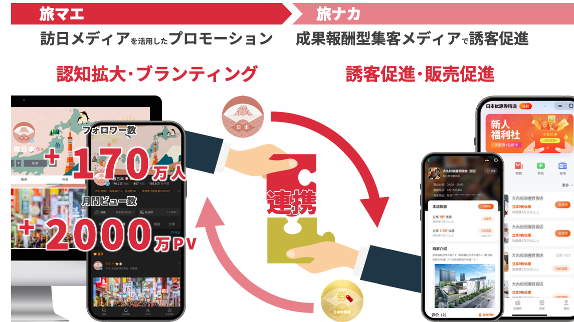 中国本土では、口コミを重要視する傾向が強いとされており、訪日旅行者のほとんどが、SNS等で情報を収集して旅行先、グルメ、文化体験、ショッピングスポットを選定すると言われています。訪日旅行者に影響力のある訪日メディア「微日本」と「Japan Coupon Park」が連携して認知拡大、集客をすることで、効果的かつ強力に集客することができます。
