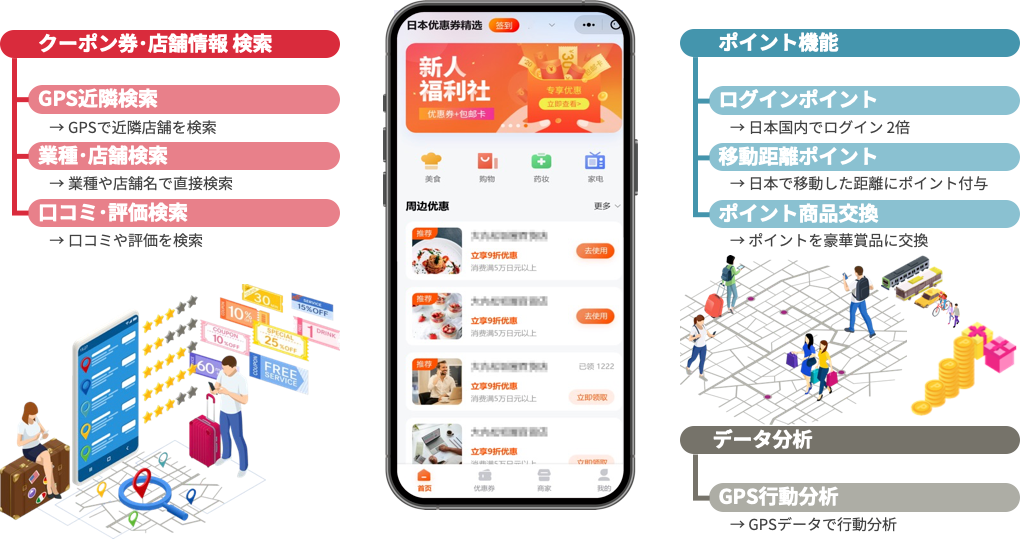 中国人旅行者の集客プロモーションを行うためには、通常は、SNSを活用して情報発信を行い、WEB広告やインフルエンサーなどを活用して認知拡大を図り、興味喚起を促進して集客する必要があります。集客までには、時間とコストがかかる上に、SNS等のツールや言語・文化の違いもあることから、プロモーションがうまくいかないといった企業様や店舗様の声を多く伺います。そんな皆様のお声と中国現地の現在のトレンドをもとに、効率よく認知拡大や集客促進することができる「Japan Coupon Park」をスタートさせ、店舗検索をはじめ、クーポンを活用した訪日中国人旅行者の集客を実現いたします。また、地域や業種、店舗名、クーポンで検索はもちろん、GPSで近隣店舗の検索も可能となっています。日本最大級の訪日メディア「微日本」と連携することで、掲載された企業様や店舗様の認知拡大、誘客促進を図るため、時間やコストは一切かけずにスタートすることができる成果報酬型の集客メディアです。