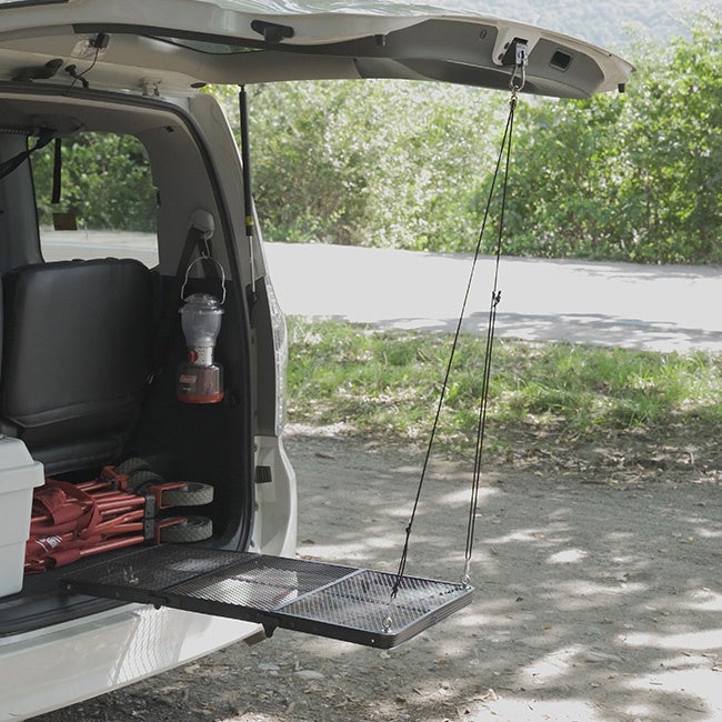 このテーブルの魅力は、その簡単な設置にもあります。脚のないデザインを活かし、ロープと固定具を使って車のラゲッジ部分に取り付け、ぬかるんだ地面やデコボコな地面でも安定して使用できます。アウトドアがより手軽で快適なものに変わるでしょう。