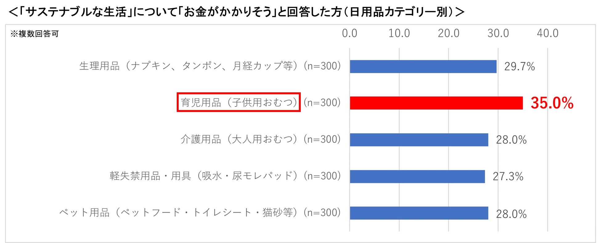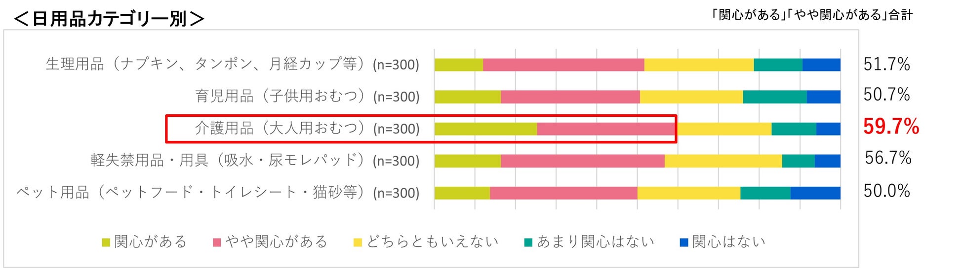 調査対象者:全国の男女20~60代。生理用品(ナプキン・タンポン・月経カップ等)/育児用品(子ども用紙おむつ)/介護用品(大人用紙パンツ)/軽失禁用品・用具(吸水・尿モレケアパッド)/ペット用品(ペットフード・トイレシート・猫砂など)を日常的に購入している人、それぞれ300名、合計1,500名に調査を実施。