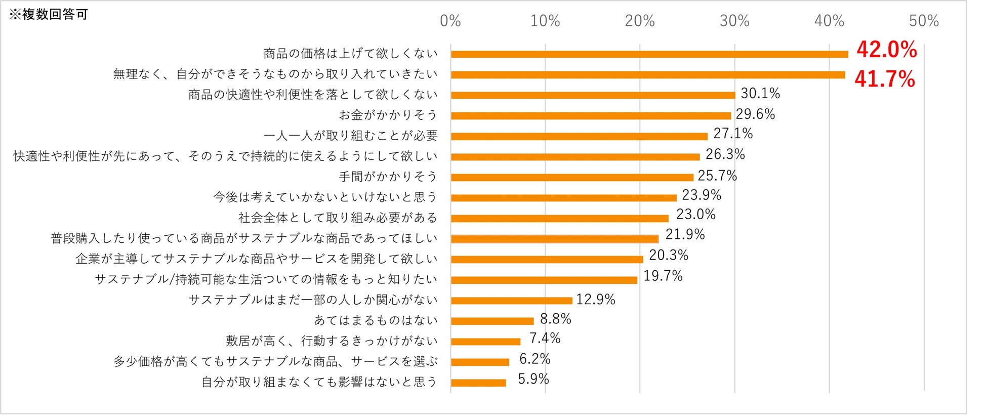 ・「サステナブルな生活」は、「商品の価格はあげてほしくない」「無理なく、自分ができそうなことから取り入れていきたい」が4割以上となる。