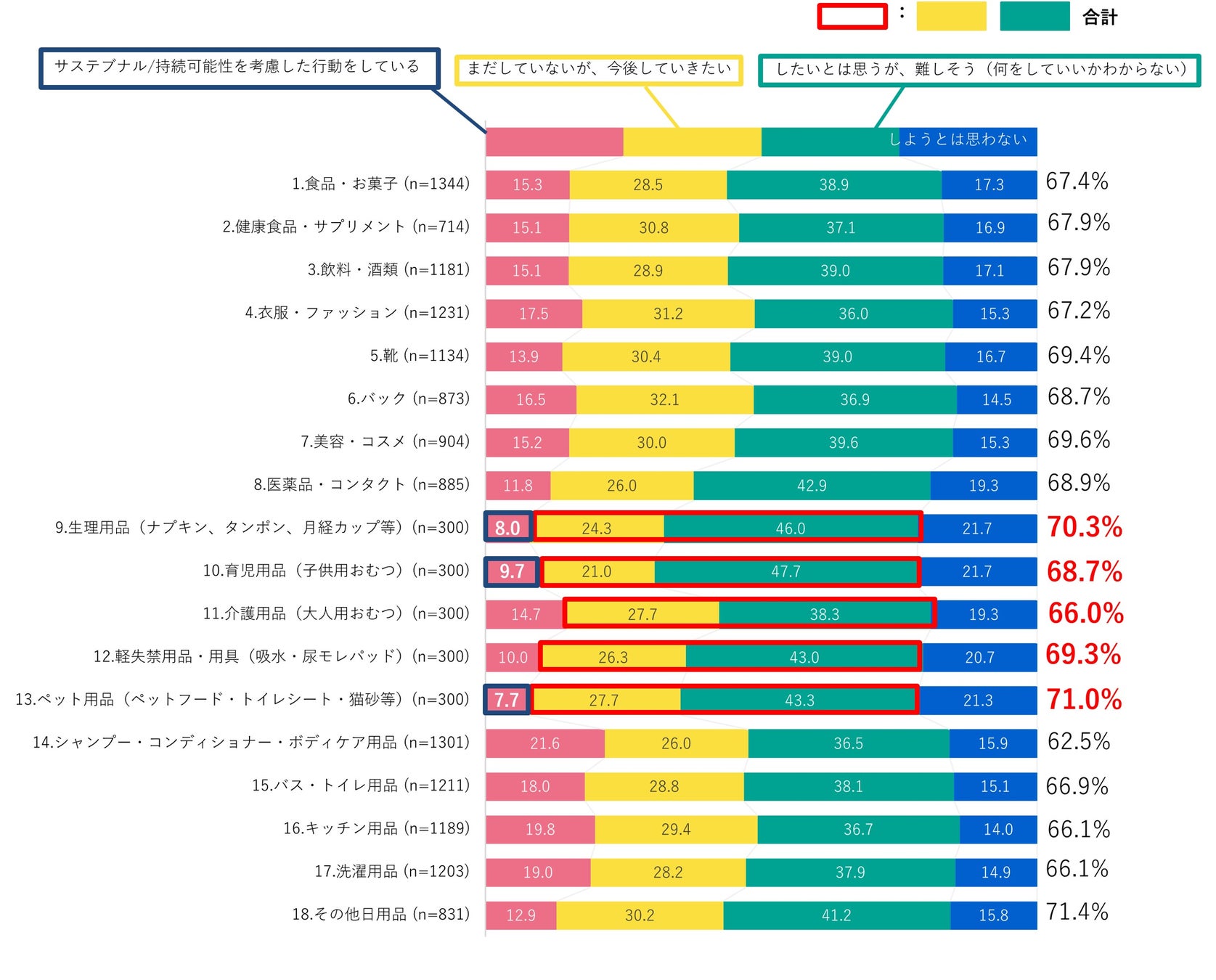 ・一方、「衛生用品」(介護用品・生理用品・育児用品・ペット用品)を購入する方は、「サステナブルな行動」の意識は1割未満にとどまる。