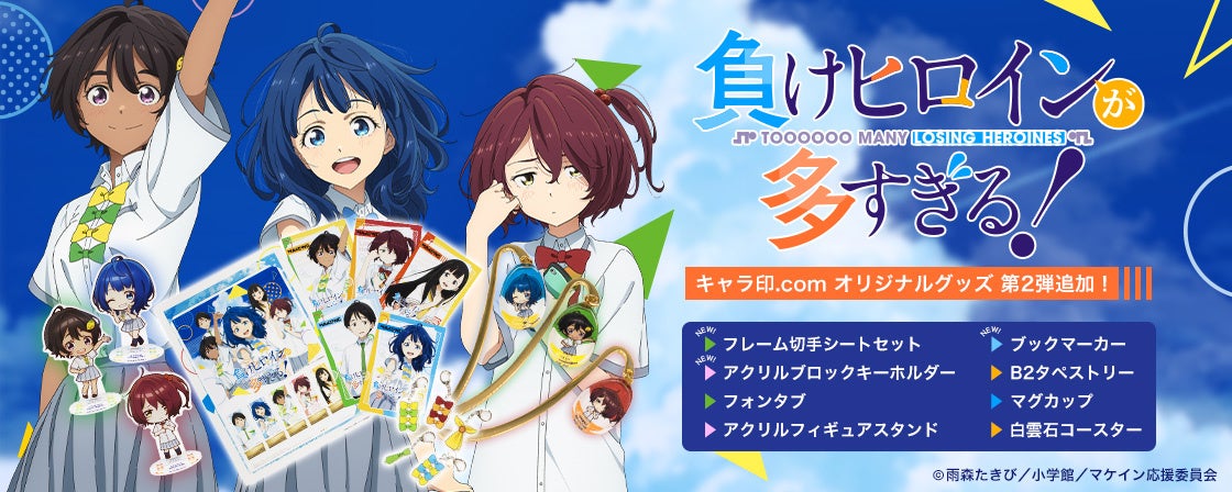 キャラ印.comがお届けするTVアニメ『負けヒロインが多すぎる!』グッズは現在販売中のアイテムも含めて、全8アイテムにパワーアップして充実したラインナップに!ぜひこれらのマケイングッズにご注目ください!