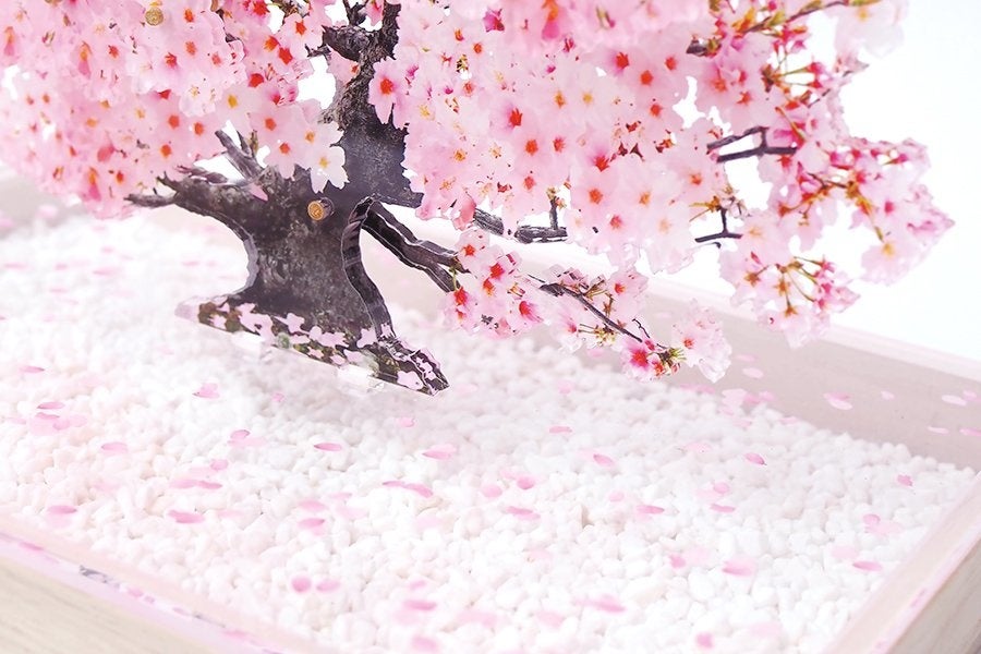 アクリル台には色づいた花びらが風に乗って地面に散った様子で描かれ、自然なかたちで美しく散るよう花びらが受ける風向きも計算されています。
