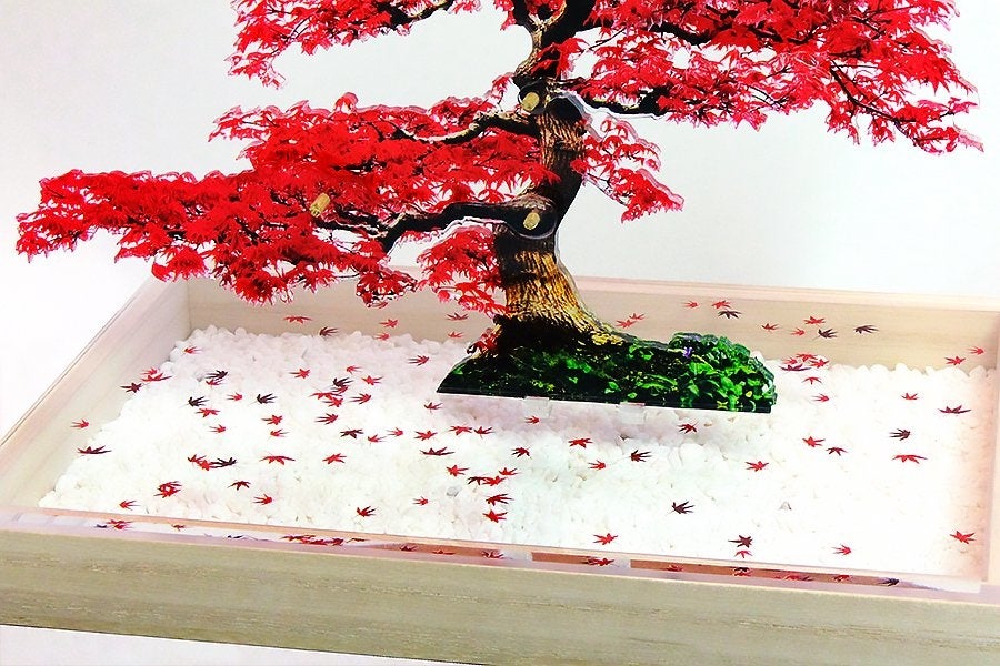 bonsai Sではアクリルの土台には色づいた葉が風に乗って地面に散った様子を描いています。