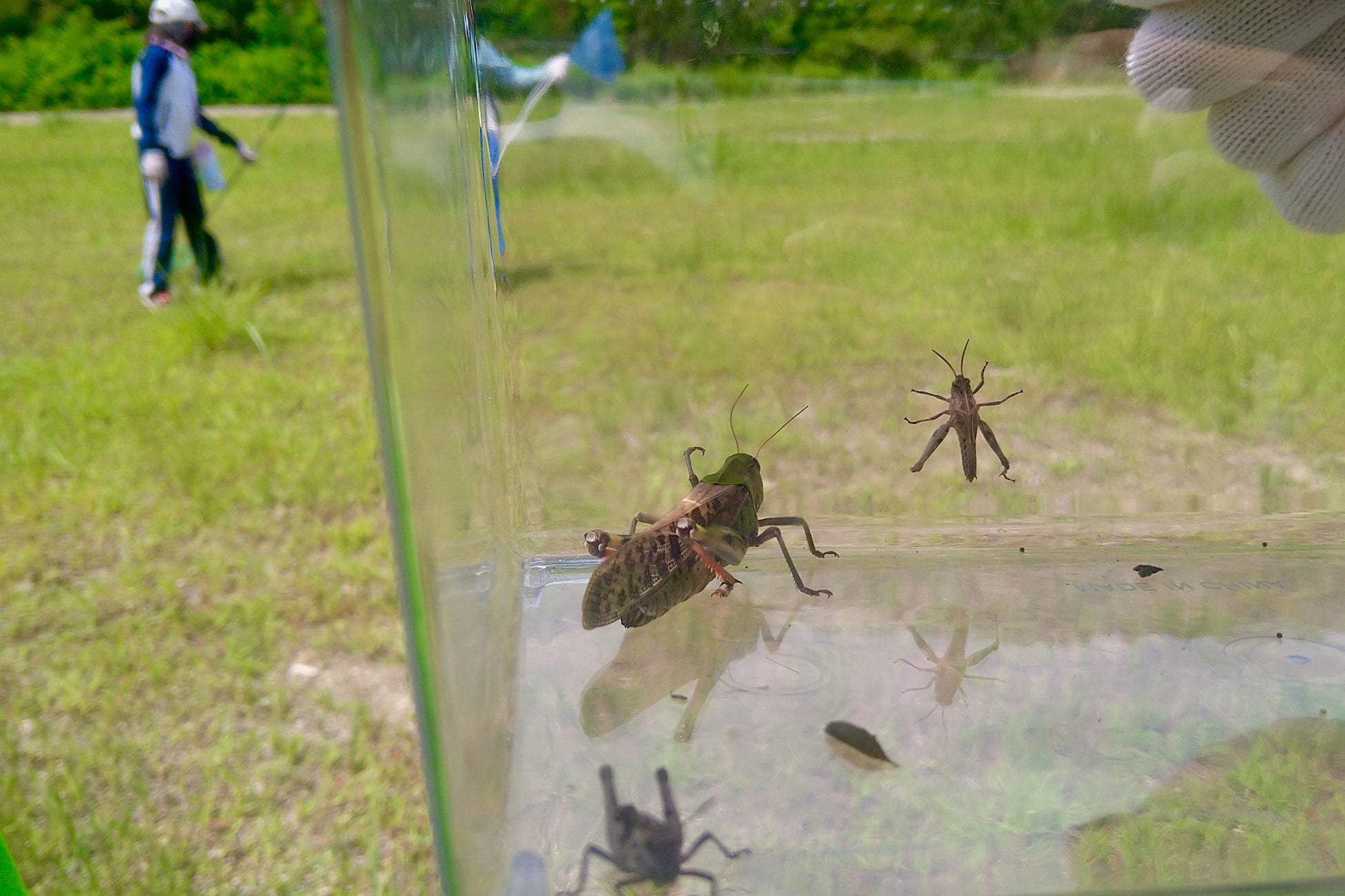 株式会社アミノアップに集合し、周辺で見られる昆虫の解説や森に入る際の注意事項等のレクチャーを受けた後、敷地裏に広がるハイテクヒル真栄緑地へ入りました(事前のレクチャー講師や観察中のガイドは、株式会社エコニクスのネイチャーガイドが勤めてくれました)。最初にネイチャーガイドが前日から仕掛けておいたトラップ(ピットフォールトラップ、ライトトラップ)にかかった昆虫の観察を行いました。ピットフォールトラップは、地面を徘徊する昆虫たちを捕まえる方法で、釣り餌の入ったコップを地面に埋めておくと匂いにつられて寄ってきた虫たちがコップに落ちて捕まります。よく見るアリから普段はなかなか見ることのない昆虫やカエルまで、たくさんの生き物を観察できました。ライトトラップは光に寄ってくる虫を捕まえる方法で、クワガタやカブトムシなど走光性の昆虫を観察できました。その後、草原へ移動しバッタやトンボ、チョウなどを虫取り網を使って採取しました。数多くの昆虫を観察したことで、環境によって生息する昆虫が違うことを学びました。最後は社屋に戻り、独自の培養方法で製造するAHCC®︎の工場を中心に見学ツアーを行い終了となりました。