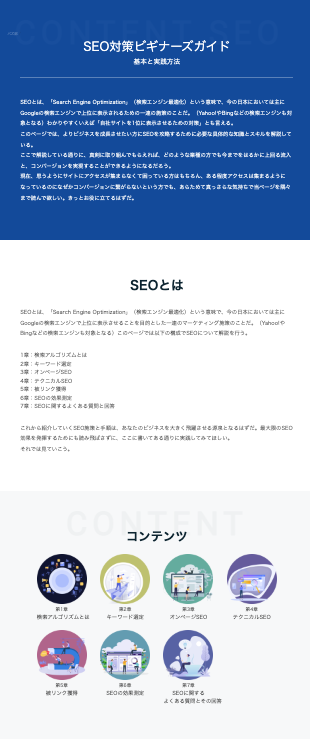 という方向けに、SEOに関する基礎知識や実践方法を丁寧にガイドするWebサイトです。全て無料で公開しています。検索エンジンの仕組み、コンテンツ制作のポイント、テクニカルSEOの基礎知識など、最新の情報を踏まえた52記事で解説しています。
