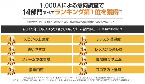 「5ラウンド以内にスコア100が切れなければ全額返金」というユニークな独自サービスを展開しており、1,000人による意向調査で、ゴルフスタジオランキング14部門でNo.1に輝いた(※)ゴルフレッスンスクールです。