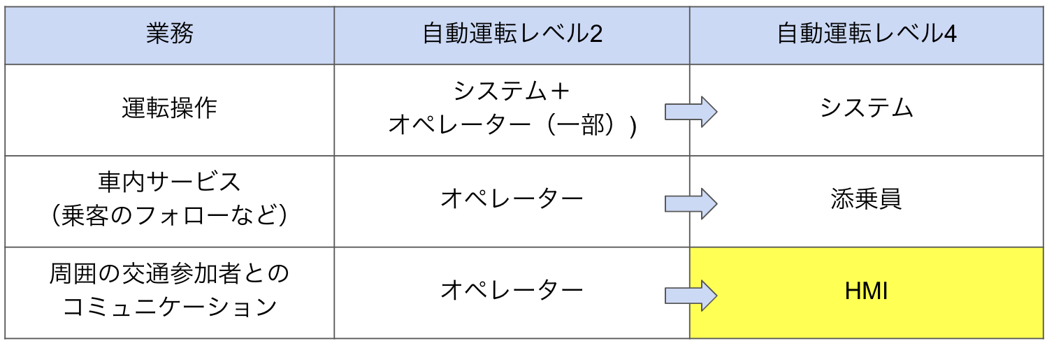 境町は、2020年11月に自動運転バスの定常運行を開始し、2年半以上にわたり自動運転レベル2での安定した運行を継続しています。運転操作の大部分はすでに自動化されている一方、車内のオペレーターの役割として、車内サービス(乗客のフォローなど)と周囲の交通参加者とのコミュニケーションが重要であることが分かりました。これは、自動運転レベル4で運転操作が完全に自動化された場合にも、乗客の安心感や社会受容性の観点から重要な業務になると想定されます。車外と適切なコミュニケーションを行うためには一定の運転経験が必要ですが、その役割をHMIが代替できれば、オペレーターの業務負荷が軽減され人材確保の間口が広がると同時に、オペレーターがこれまで以上に車内サービスに専念することができます。また、将来自動運転バスが十分に普及して車内にオペレーターや添乗員を配置せずに運行する場合にも、HMIが有効だと考えられます。