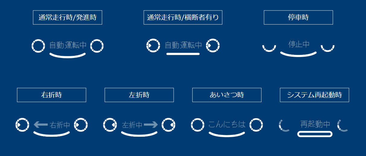 市光工業とBOLDLYは、本実証に先立ち、文字と顔表情の他に、ピクトグラム(情報を示すための単純化された絵)などさまざまな表示方法を検討し、受容性と理解度を検証してきました。本実証で使用する外向けHMIに表示される内容には、その検証結果を反映しています。文字に加えて表情を表示することで、自動運転バスの状況を直感的に伝える効果や自動運転バスと他の交通参加者の間の信頼関係構築や親密性向上への効果が期待できます。これらは自動運転バスの社会受容性を高め、地域住民と自動運転バスのより良い共存につながると考えられ、本実証ではその効果についても検証します。