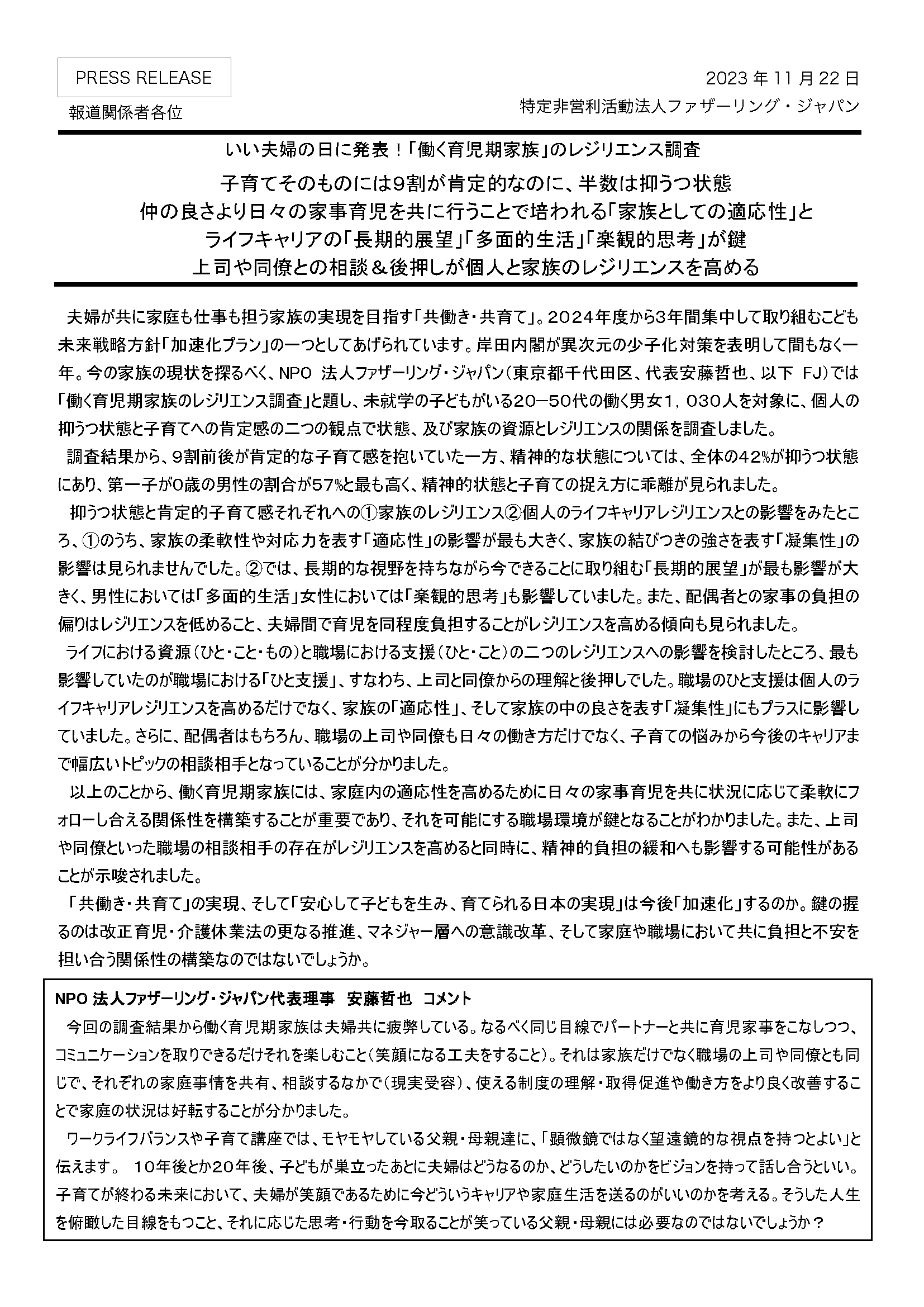 いい夫婦の日に発表!「働く育児期家族」のレジリエンス調査