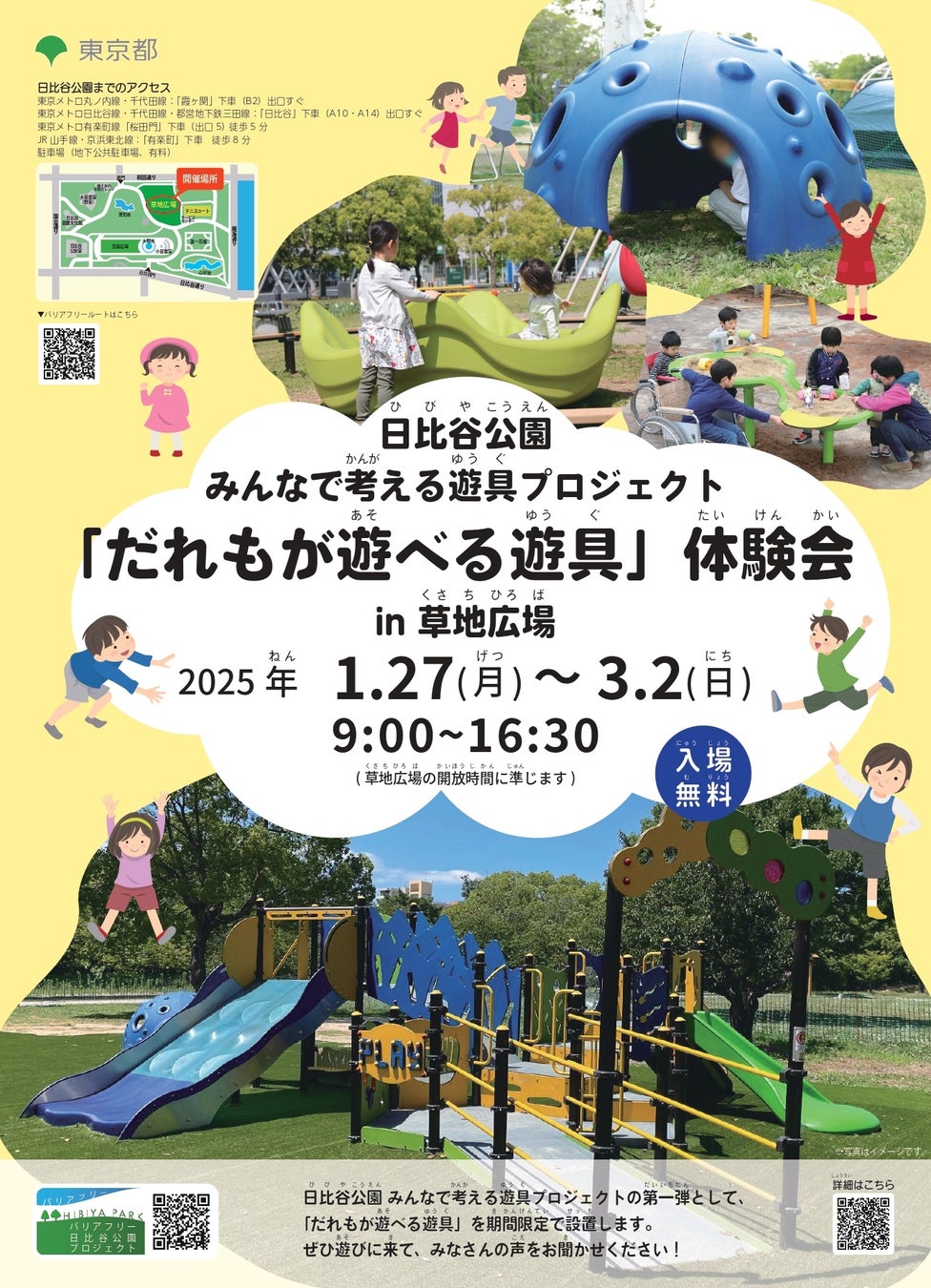 東京都の受託事業として、『日比谷公園 みんなで考える遊具プロジェクト「だれもが遊べる遊具」体験会』を実施いたします。