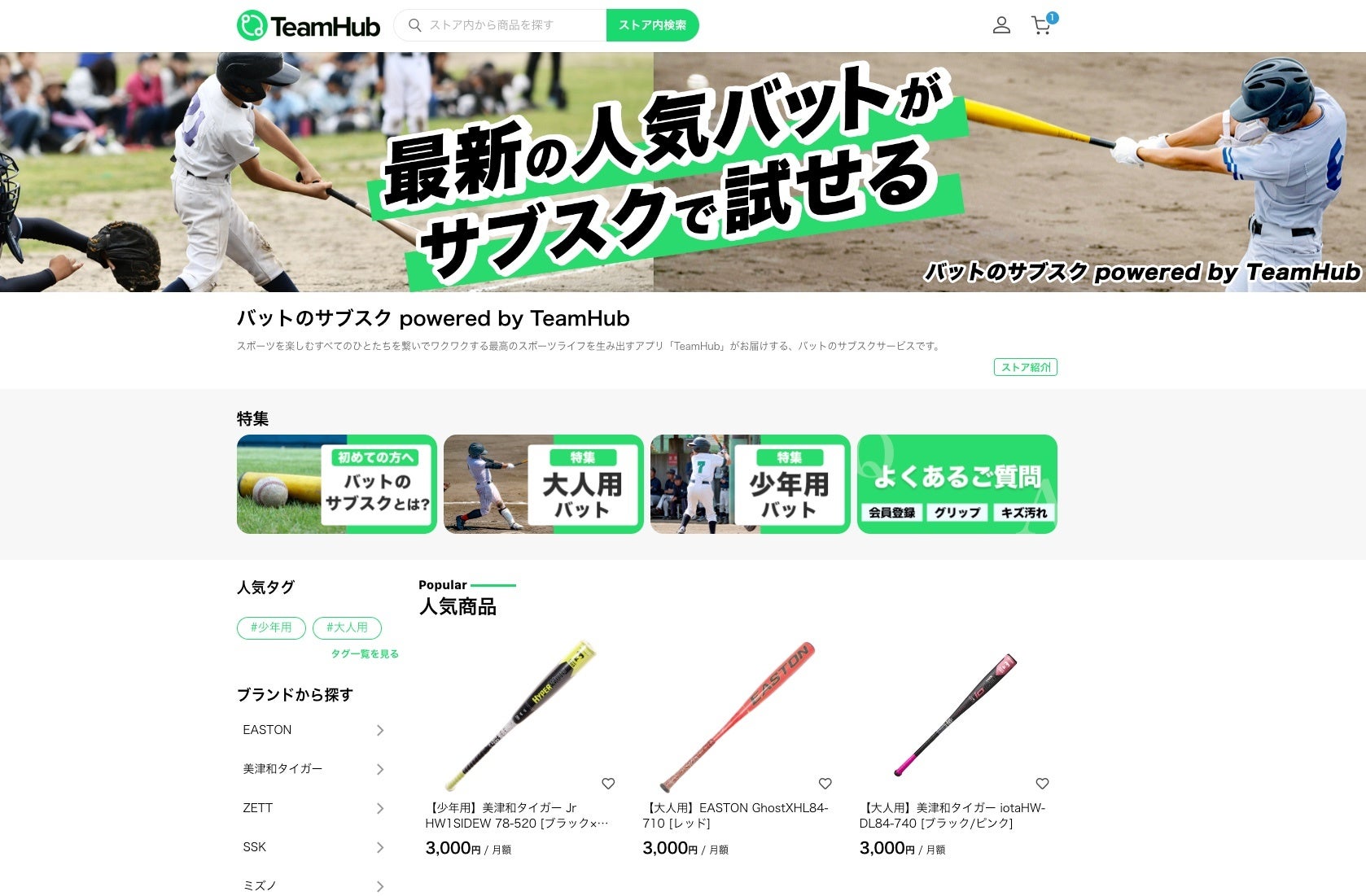 TENTとTeamHubが共同で提供するバットのサブスク(月額レンタル)サービスです。このサービスでは、購入すると3〜5万円程度の高価格/高性能バットを月額定額(月額3,000円/本)で気軽に利用できます。