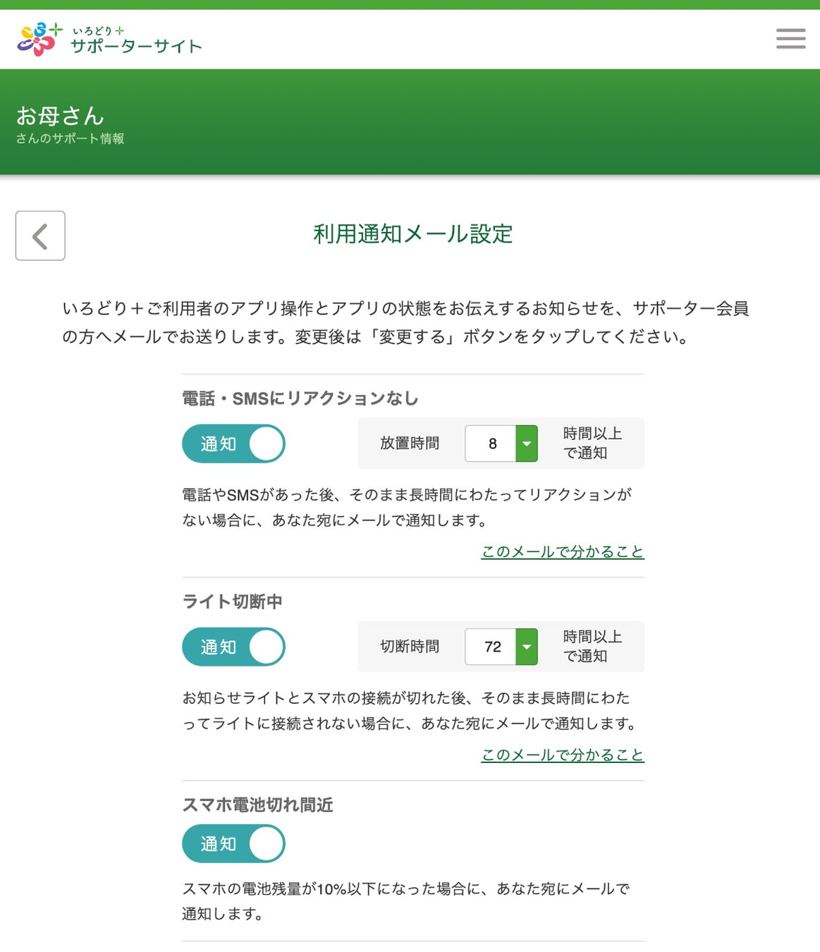 サポートするご利用者の『いろどり+』アプリの設定を、サポーターサイトでも変更できます。
