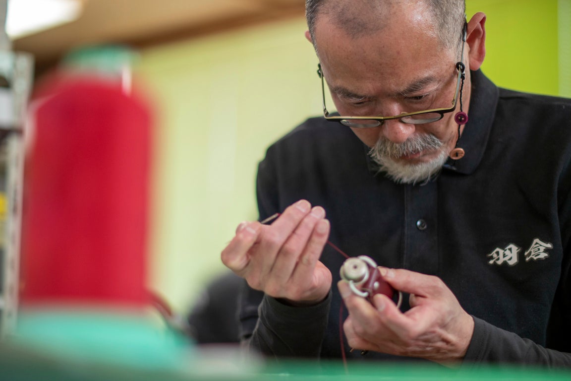 専任デザイナー監修の色を皮革メーカーに発注して完成させた「羽倉色」や「鋲なしフラップ」(意匠登録:1612572号)など、職人のこだわりが詰まった羽倉ランドセル。製品は地域ブランド「豊岡鞄」に認定されており、コバ塗りや菊寄せといった職人技が随所に光っています。