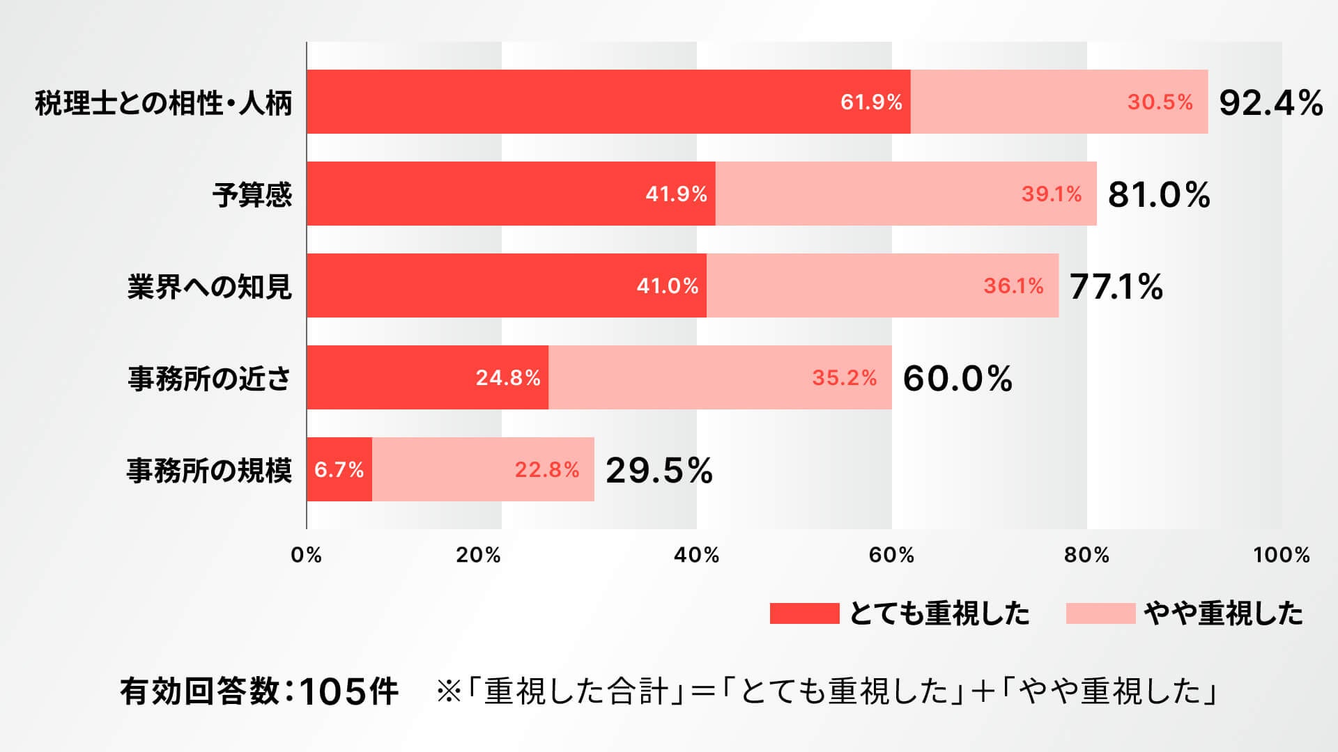 最も重視されたポイントは「税理士との相性・人柄」で、92.4%のお客様が重視したと回答(うち「とても重視した」は61.9%)。次いで「予算感」(81.0%)、「業界への知見」(77.1%)が続き、費用・専門性も重要視されていることがわかります。一方、「事務所の規模」は重視する割合が29.5%にとどまり、規模よりも"人"や"相性"が決め手となっています。