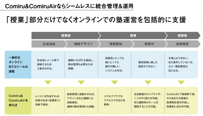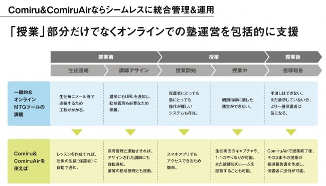 またComiru以外にも、オンライン授業ツールの「ComiruAir」や、講師労務管理・講師向けのミュニケーションツール「ComiruHR」の提供も開始。Comiruと併用することで、塾経営のさらなる生産性向上や生徒の学力向上を支援します。